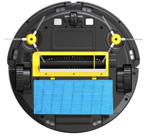 A rear view of the robot reveals two drive wheels and a front swivel caster for propulsion. To prevent the vacuum from falling down stairs or other tall objects, the bottom is equipped with height-detection sensors. Additionally, the bottom houses side brushes, a central brush for more effective carpet cleaning, a suction port, two small contact pads for docking and charging, a battery compartment cover, and an on/off button. A damp cloth can be attached to the bottom for wiping surfaces.