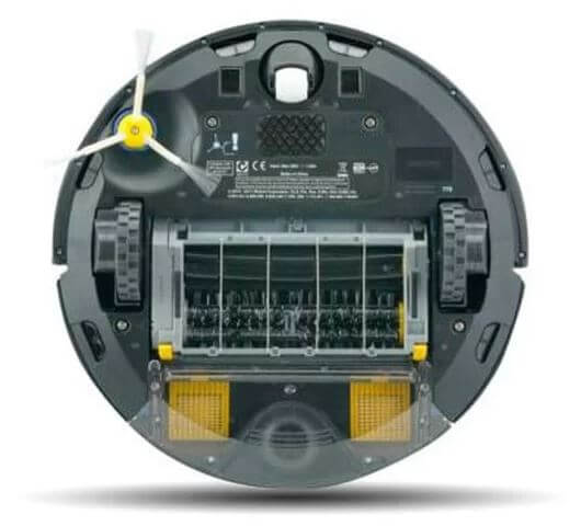 A view of the central part of the bottom of the device reveals two wheels that move the device. Between them is a brush assembly.