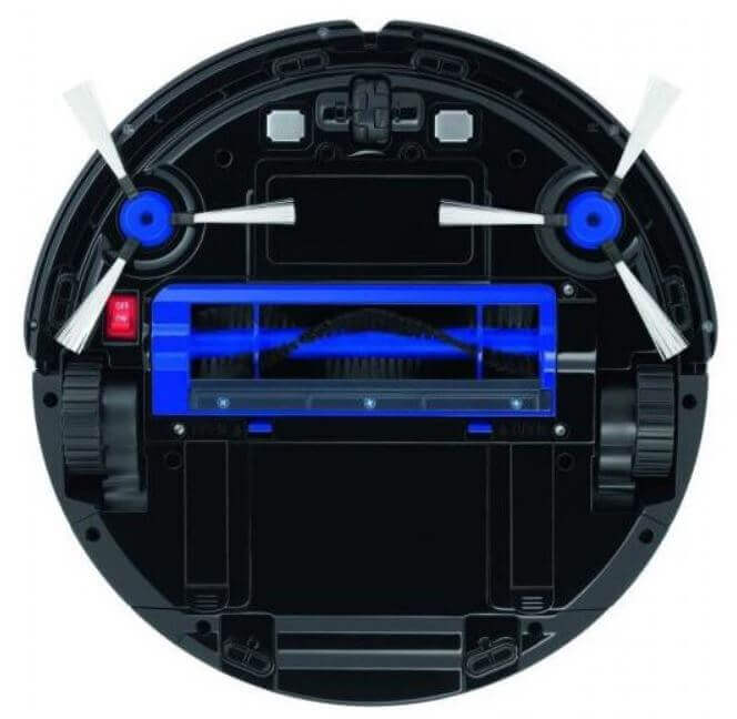 On the bottom of the device there are two drive wheels, one small wheel at the front for maneuvering, two contacts for docking with the base, a battery compartment, a pair of side brushes and a central turbo brush.