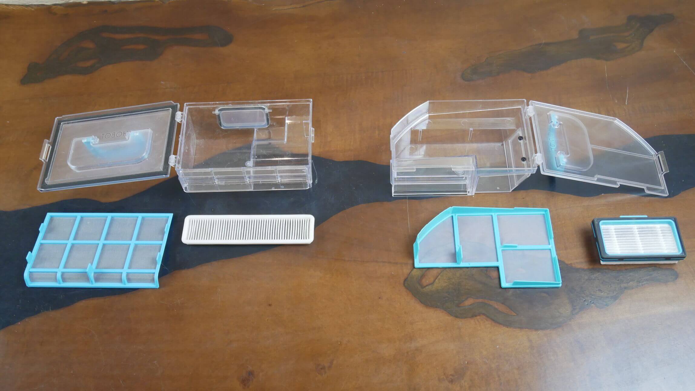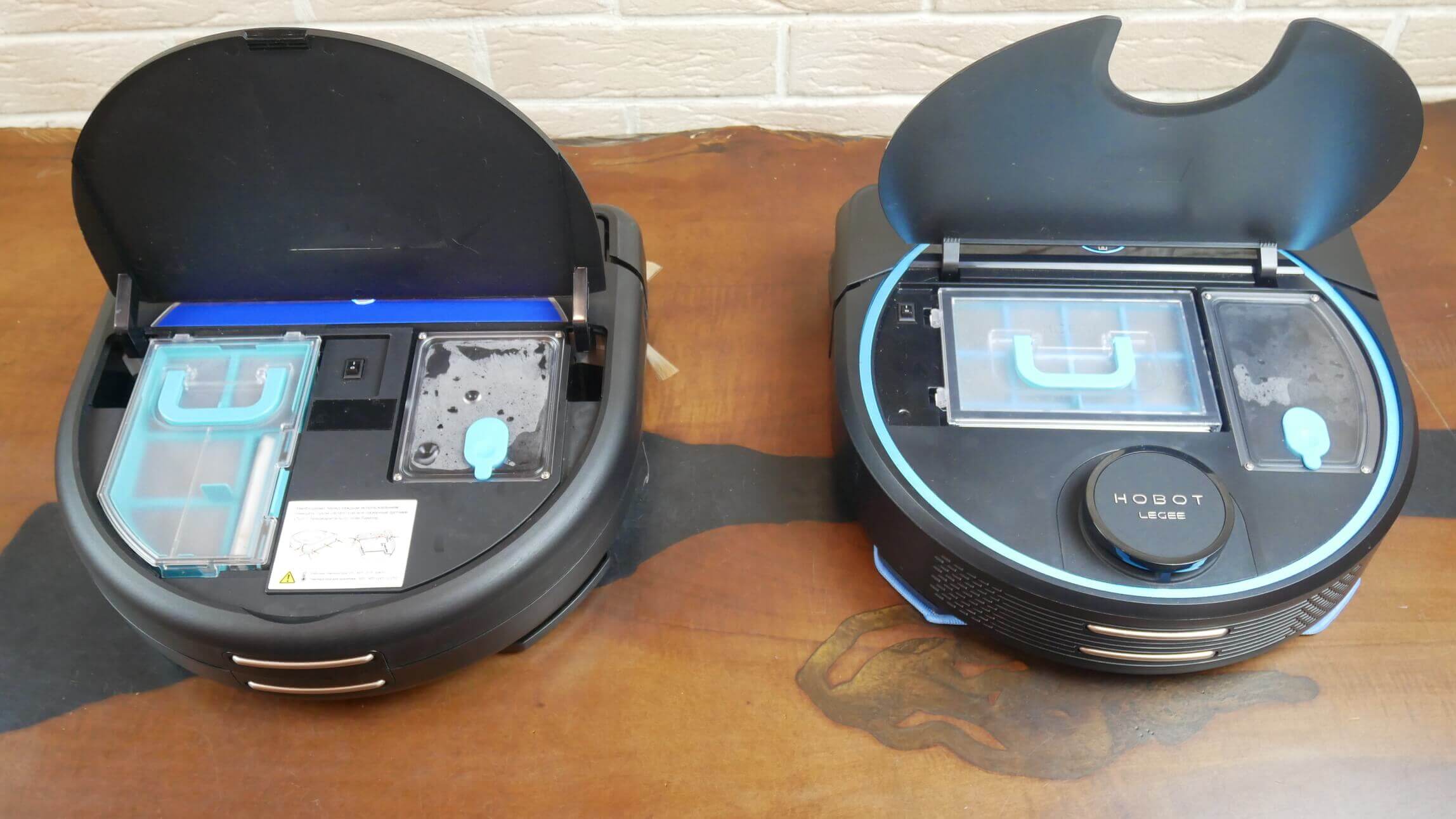 Moving on, the dust collectors and water tanks of these two robots are located on top, under the lid. The shapes of the water tanks and dust containers are different, so they are not interchangeable, as are the HEPA filters.