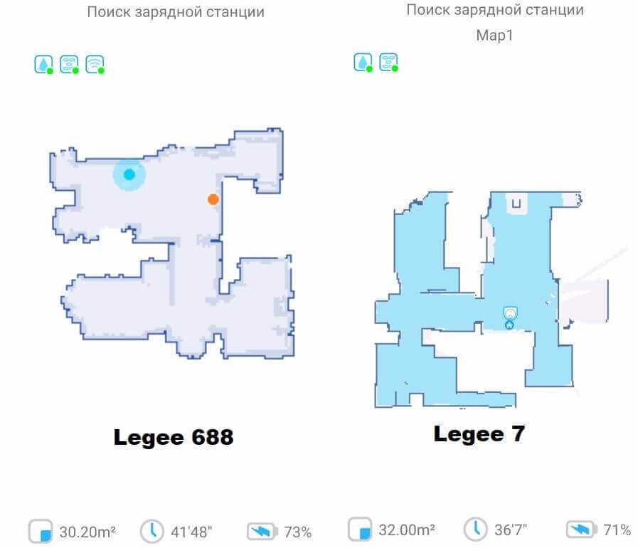 As you can see, the Legee 688's battery lasted for six runs, covering approximately 66 square meters, to be precise. The Legee 7 completed eight full runs, and by the ninth run, the battery charge reached 17%, after which the robot returned to its base. After fully charging, the robot completed its final cleaning cycle and returned to its base. In any case, in 8.5 runs, the robot covered almost 96 square meters, which is almost one and a half times more.