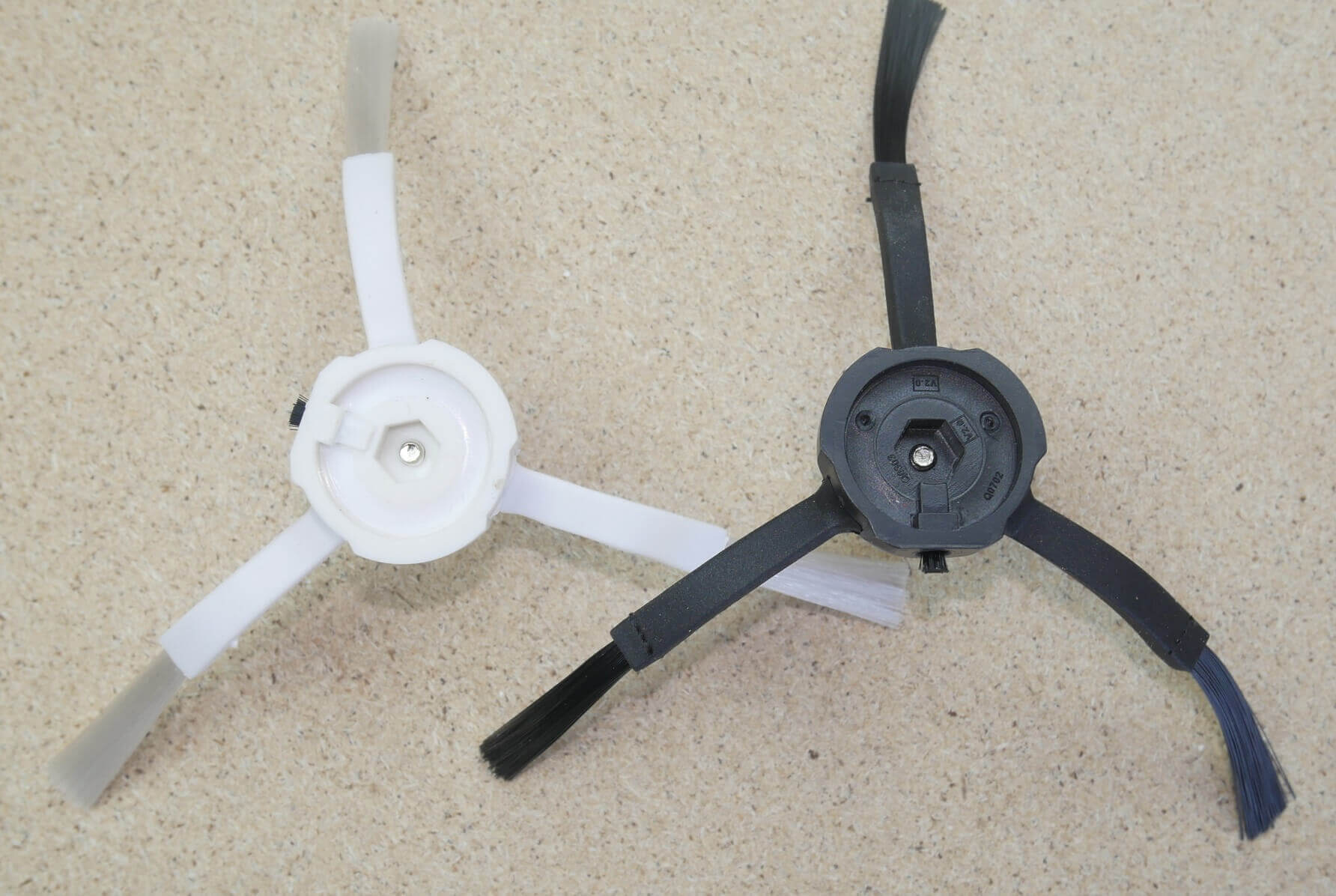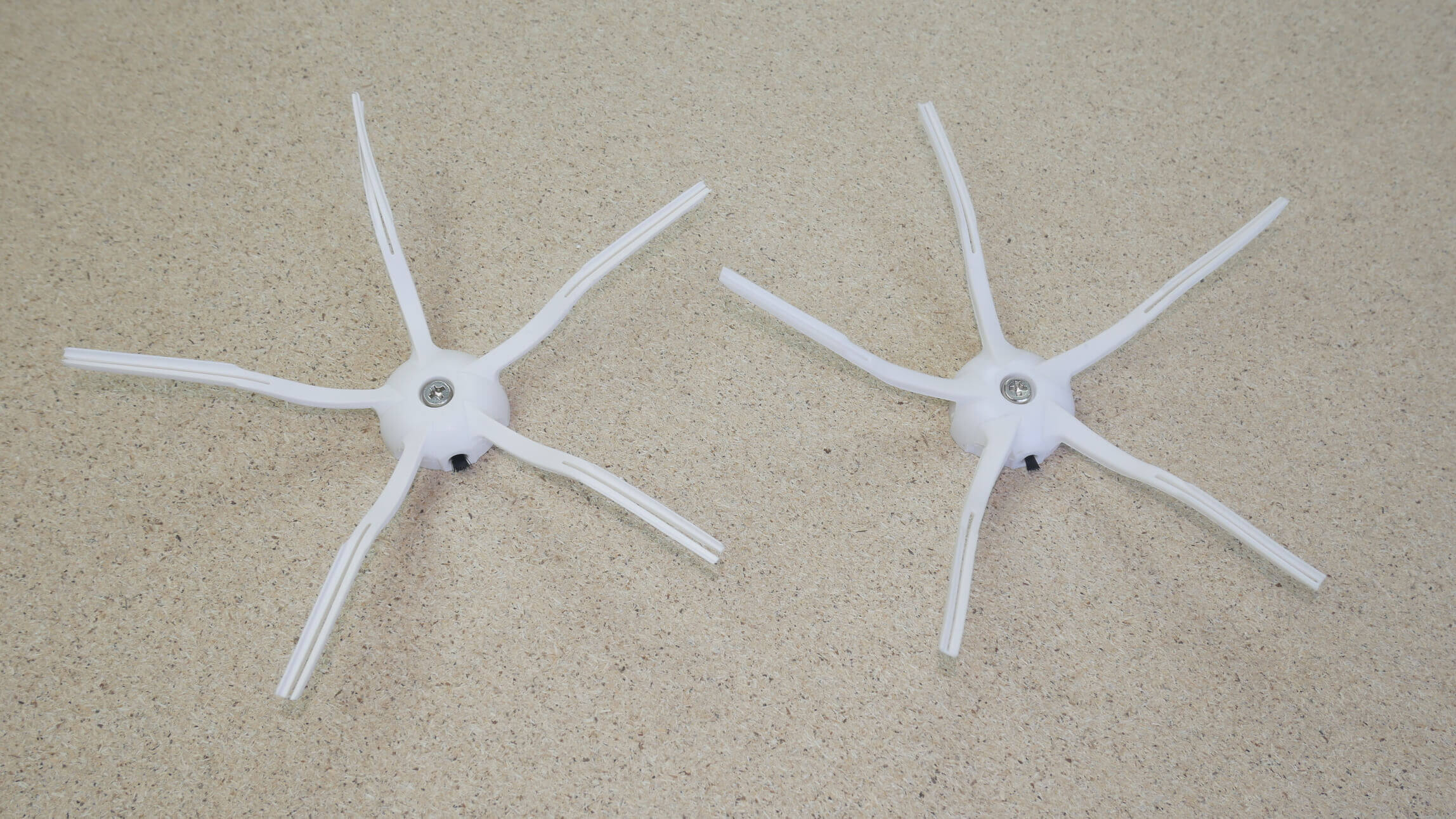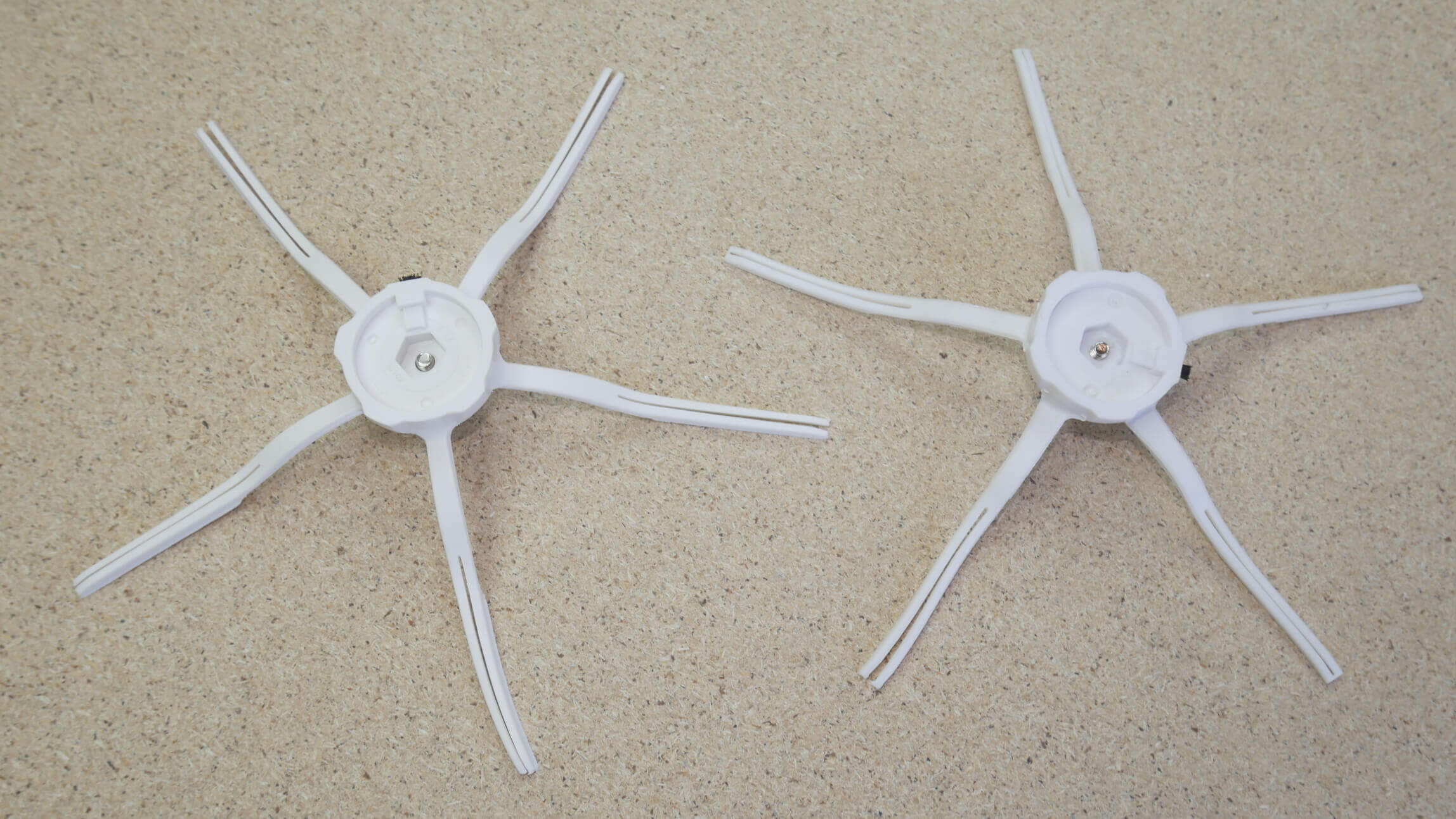Moving on, let's compare the five-point side brushes. They're found in the new Roborock robot vacuums. Visually, they look identical, but it's immediately noticeable that the brush center and the screw itself are slightly offset on the Chinese version. This could affect the motor's performance in the future.