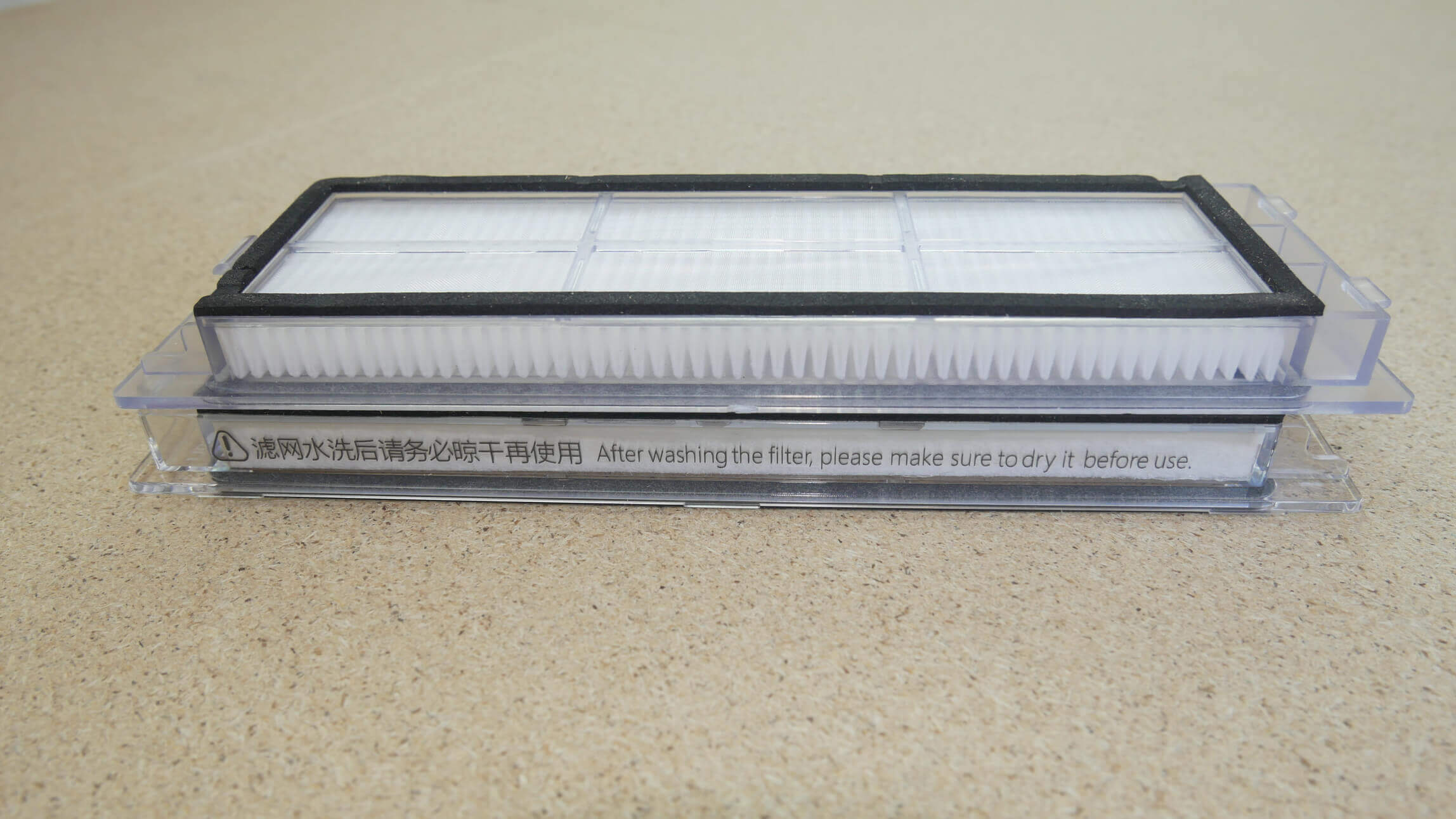 Let's move on to comparing HEPA filters. And here's where it gets really interesting. They're the same size. On the side of the original filter, we see a warning from the manufacturer that it's essential to dry the filter after washing: