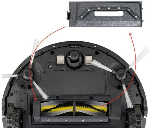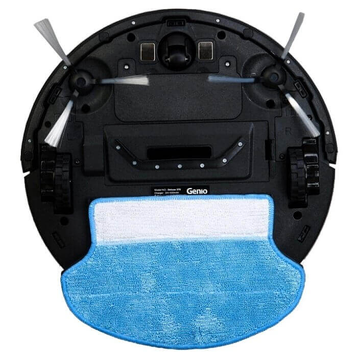 La base alberga dos cepillos laterales, un compartimento para la batería, una unidad de limpieza en húmedo extraíble y dos ruedas motrices. Un vistazo más de cerca revela la característica única del dispositivo: las unidades de limpieza extraíbles. La base central alberga un puerto de succión, que puede sustituirse por un cepillo turbo si es necesario.