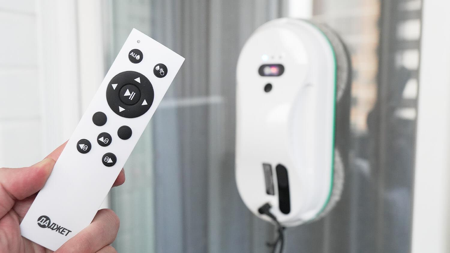 El robot limpiacristales se controla mediante el control remoto incluido. Incluye botones para el suministro automático de líquido, pulverización manual, parada, inicio/pausa, control manual del robot y tres modos automáticos: arriba y abajo, izquierda y abajo y derecha y abajo.