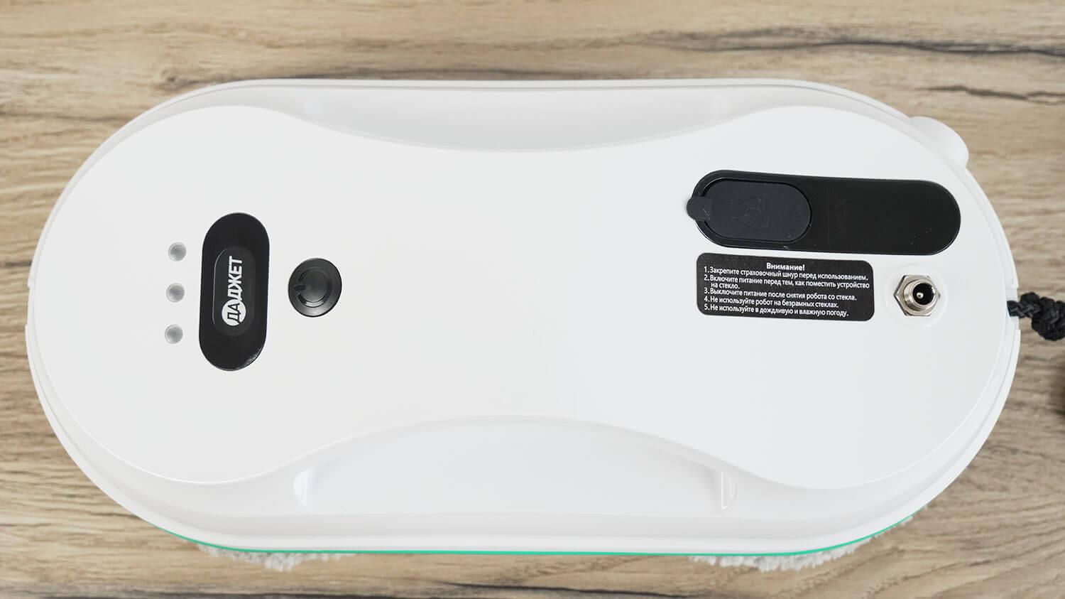 El cuerpo cuenta con ranuras para facilitar el agarre al instalar y retirar el robot de una ventana. En el otro lado se encuentra un botón mecánico de encendido/apagado e indicadores de estado del robot.