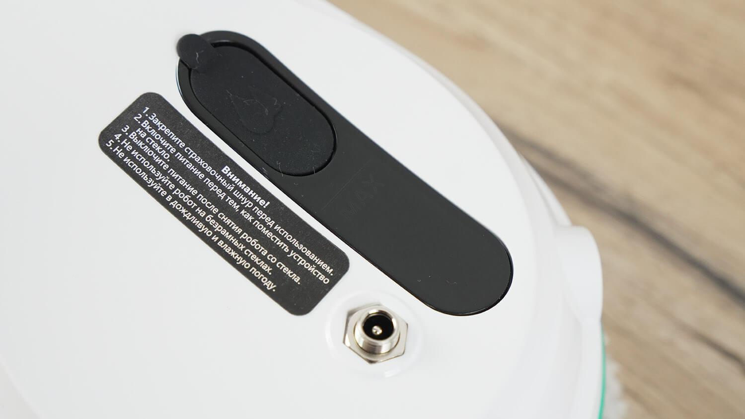 El robot viene con un anclaje de seguridad y un mosquetón incluidos de fábrica. En la parte superior hay un conector de cable de alimentación roscado y un depósito de agua de 50 ml.