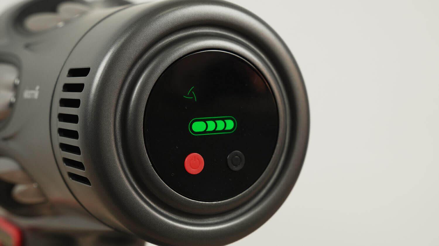 En el extremo hay una pantalla con dos botones de control: encendido/apagado y selección de modo. Hay tres modos: ahorro de energía, estándar y alto. La cubierta que rodea la pantalla se puede retirar para acceder al filtro HEPA de soplado.