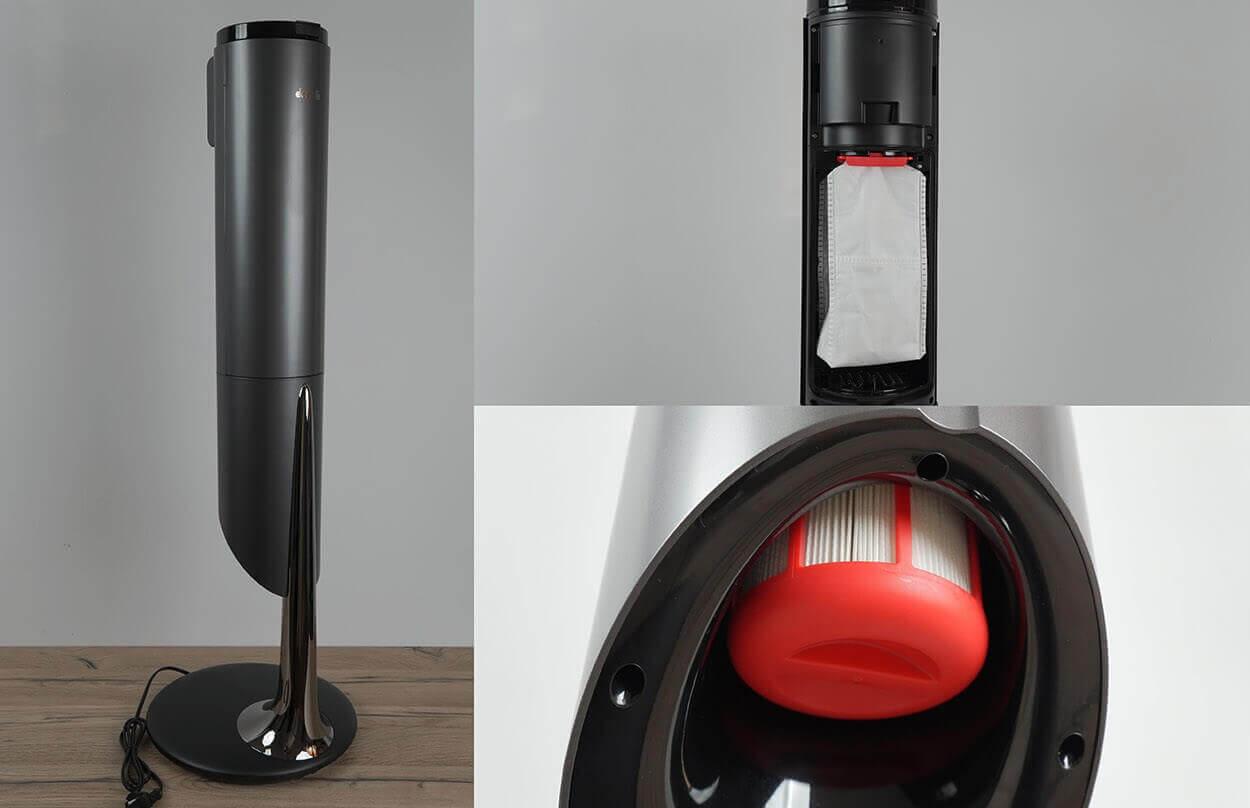 Hablando de la estación, también está disponible en color grafito. Tiene un acabado mate, lo que la hace menos sucia que la estación Deerma DEM-T30W analizada anteriormente. El diseño es idéntico. La autolimpieza se activa manualmente pulsando un botón en la parte superior. Una bolsa de 1,8 litros se esconde tras la tapa. Es un diseño estándar. Hay un filtro de tela instalado debajo de la bolsa, pero lo que más me gustó fue el filtro HEPA instalado debajo de la estación. ¡Las personas alérgicas agradecerán esta característica!