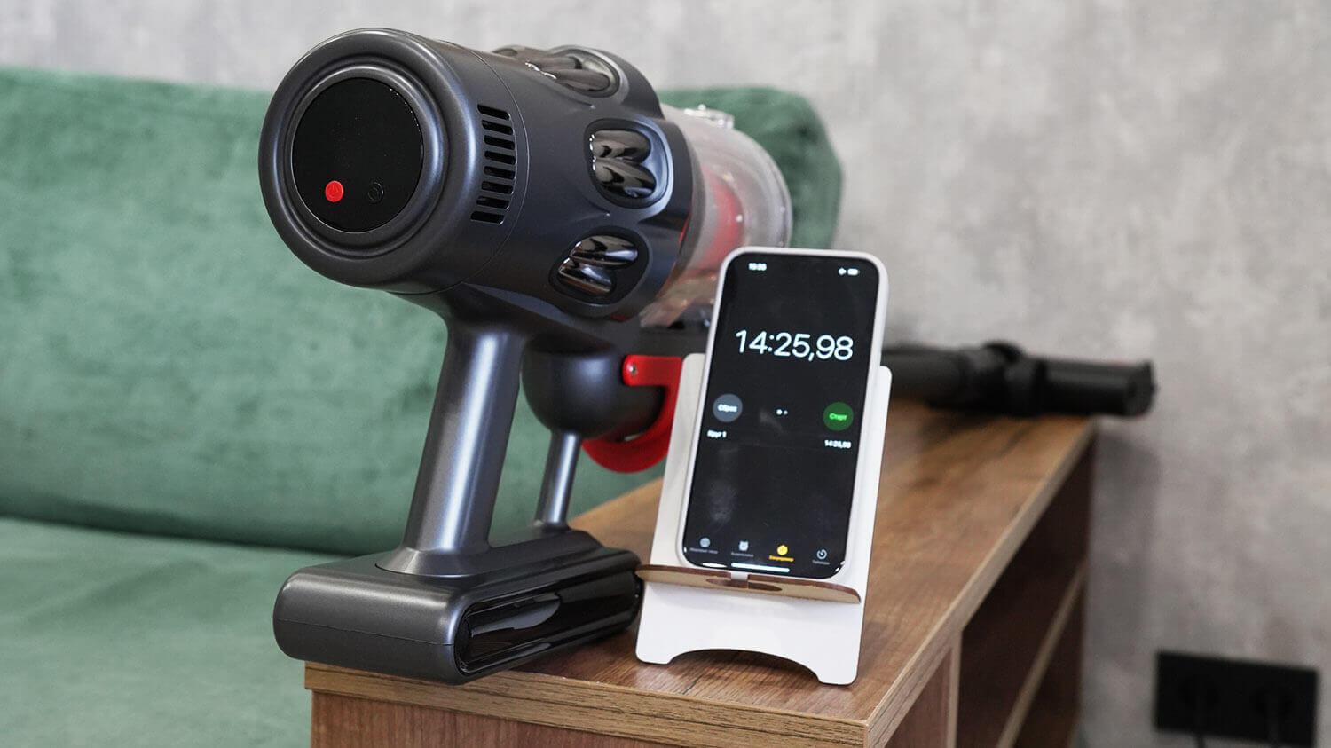Y finalmente, pasemos a las pruebas. Primero, comprobemos la duración de la batería de la estación Deerma DEM-T50W en modo Turbo con la boquilla principal para suelos conectada. Logró funcionar durante 14 minutos y 25 segundos, lo cual es un buen resultado. La mayoría de los dispositivos similares solo duran entre 10 y 12 minutos a máxima potencia.