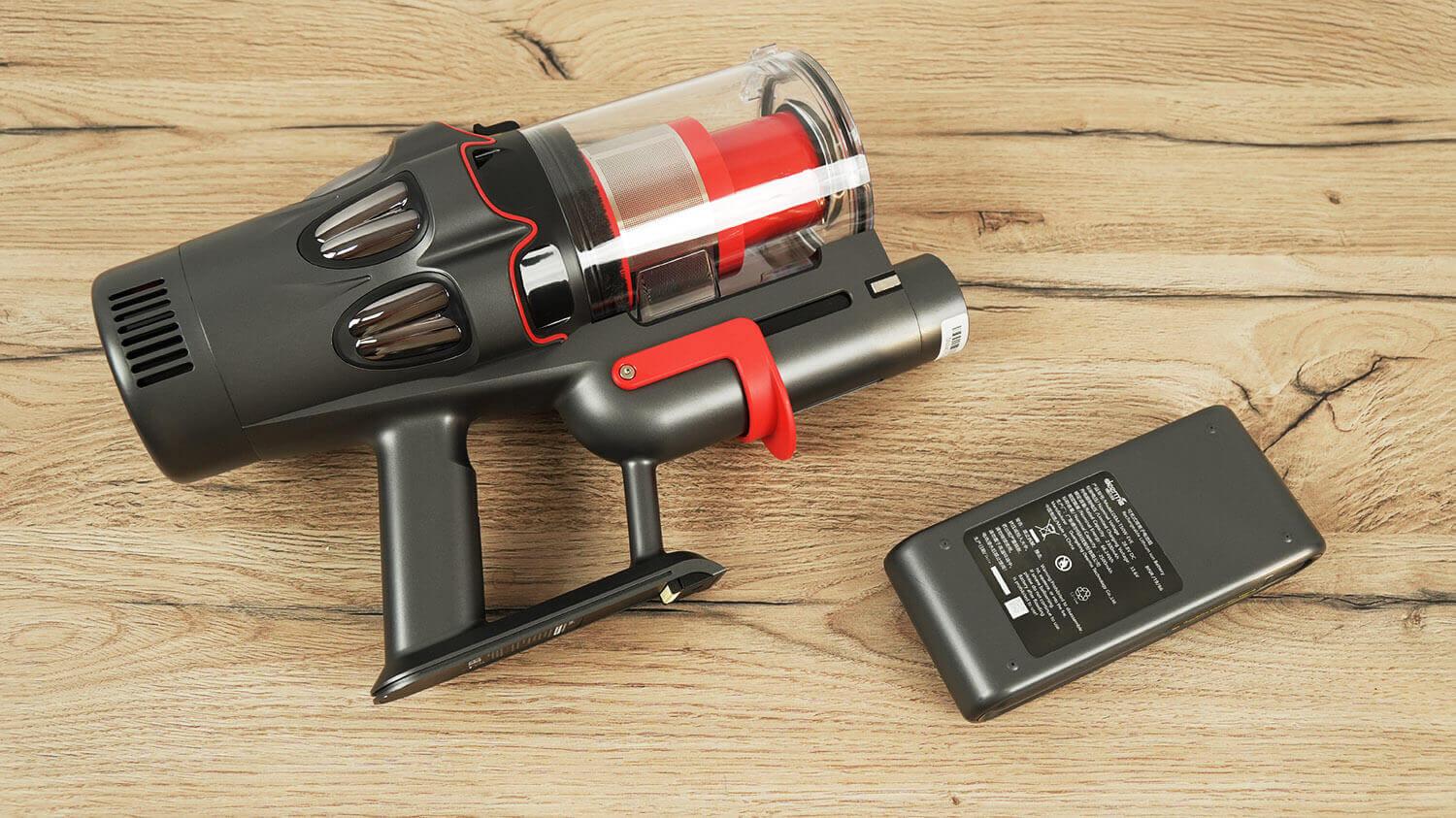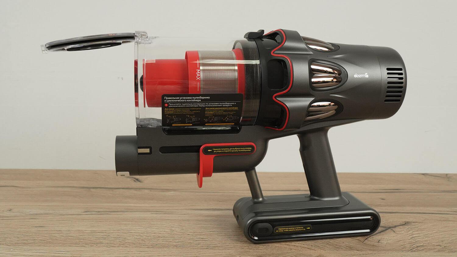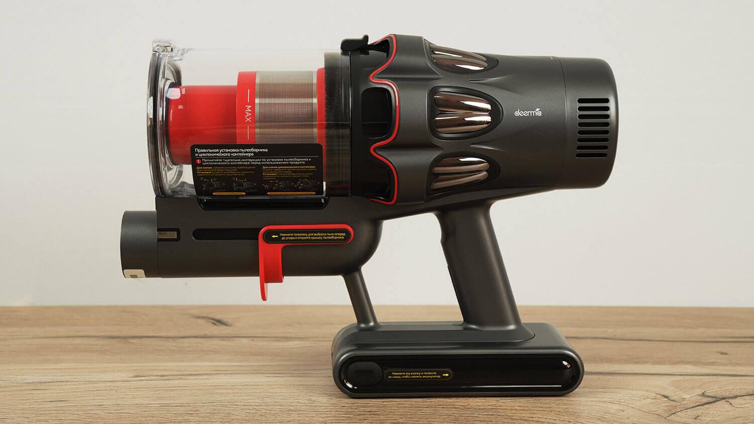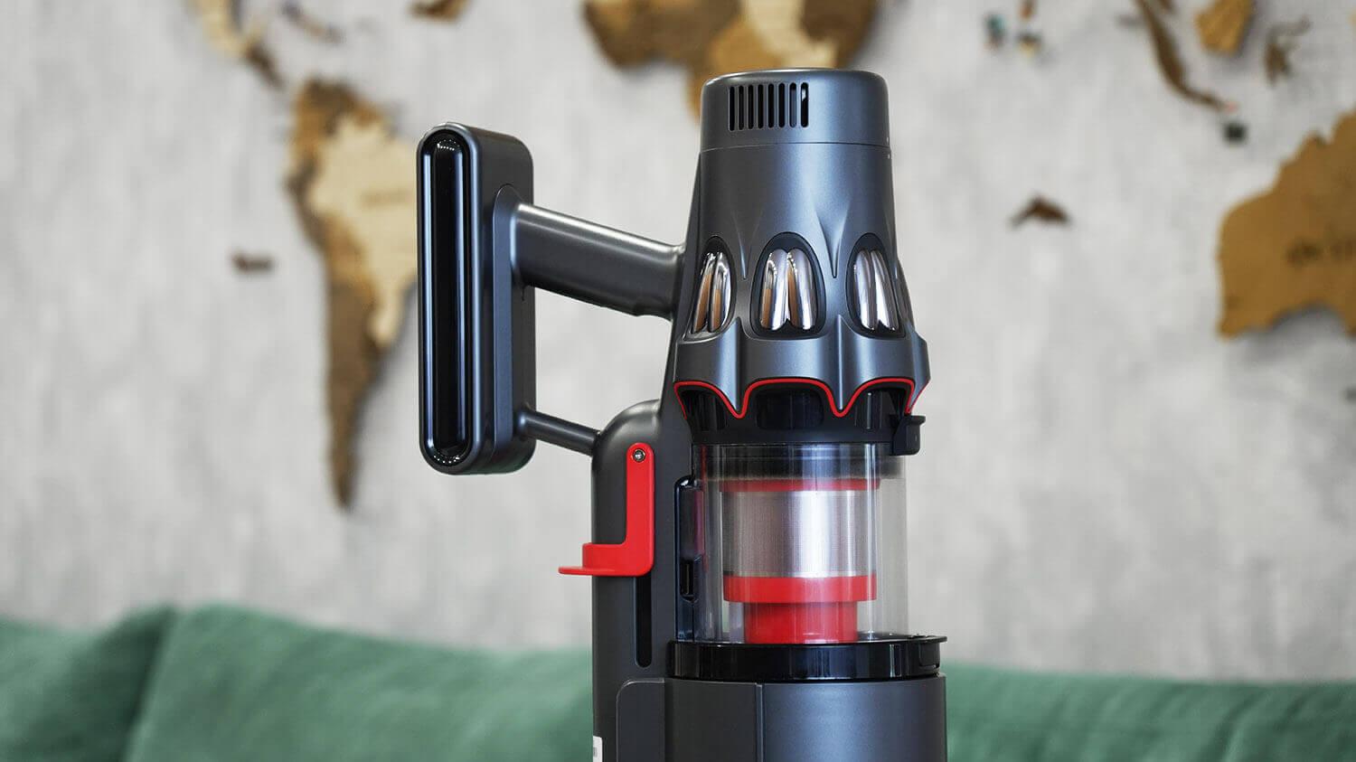 Ahora veamos el diseño de la Deerma DEM-T50W Station. Empecemos por la aspiradora, concretamente por su unidad principal. Su acabado combina grafito y rojo. En su interior, un motor de 590 vatios ofrece una potencia de succión de hasta 27 kPa.