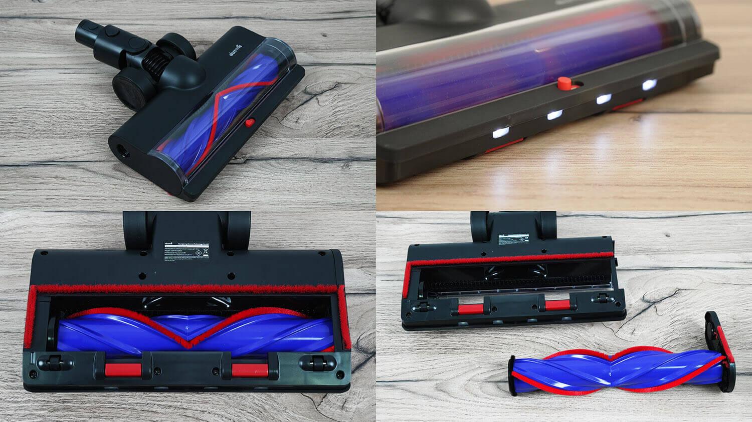 La boquilla para pisos cuenta con un rodillo suave, ideal para limpiar pisos duros. Una luz lateral ilumina el área de limpieza, lo cual es una ventaja. El rodillo se desmonta fácilmente sin herramientas. El diseño es familiar. Detrás del rodillo, también hay un peine, lo cual es una ventaja.
