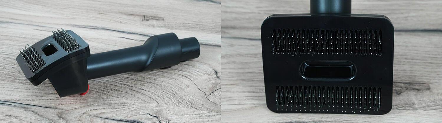 El accesorio para limpiar tapicerías tiene un diseño interesante. El rodillo es ligeramente más corto, probablemente para facilitar la eliminación del pelo enredado. Además, se desmonta fácilmente sin herramientas. Las cuchillas del rodillo son de silicona, lo que facilita la eliminación de residuos sin enredos.