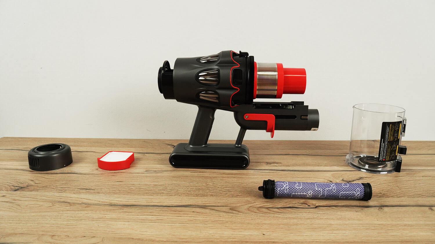 Si es necesario, el matraz se puede extraer por completo para limpiarlo. Dentro del ciclón hay instalado un filtro de tela premotor. Se puede lavar con agua. Sin embargo, ni el ciclón ni su malla son extraíbles, lo cual resulta incómodo. Suelo limpiar este componente con agua, extrayéndolo por completo, como ocurre con la mayoría de dispositivos similares.