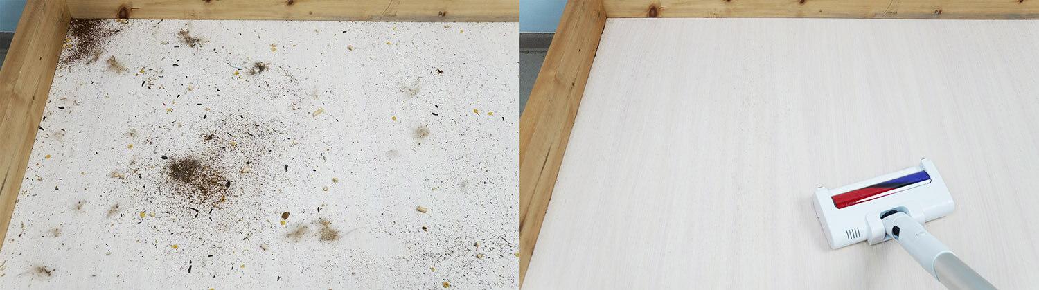 Ahora, probemos qué tan bien recoge la aspiradora los residuos del suelo. Esparcí varios tipos de residuos sobre el suelo laminado: pelo, piel, granos, arena para gatos y otros residuos domésticos pequeños. La aspiradora recogió la mayoría de los residuos, pero al intentar recoger residuos más grandes, como arena para gatos, el rodillo a veces se bloquea y la aspiradora entra en un estado de error, obligándome a retirar manualmente los residuos atascados.