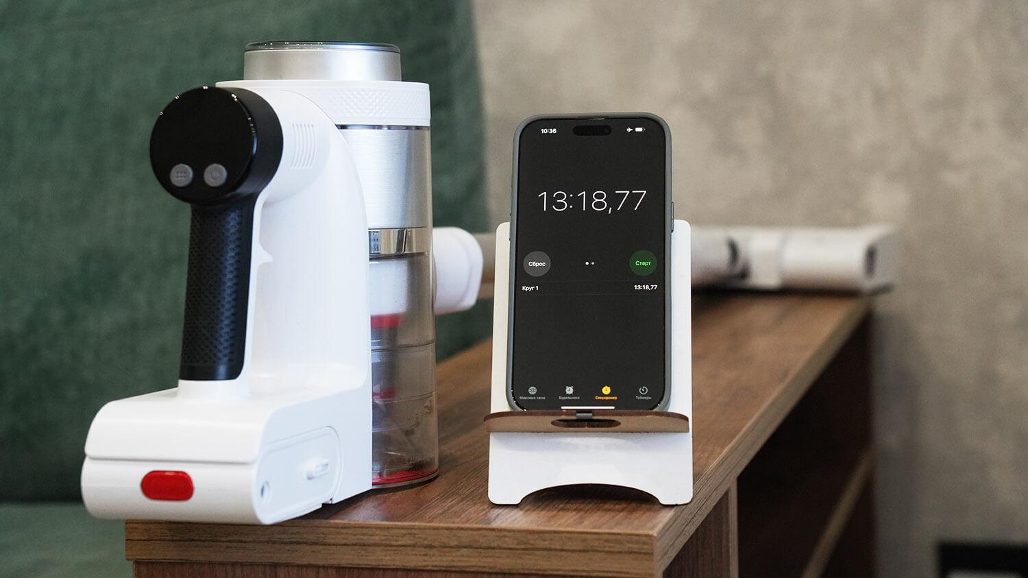 Y finalmente, pasemos a las pruebas. Primero, comprobemos la duración de la batería de la EVOLUTION Smart Clean VCF2613UV Wet and Dry a máxima potencia con la boquilla principal para suelos conectada. Logró funcionar durante 13 minutos y 18 segundos, un resultado aceptable. La autonomía estándar de las aspiradoras inalámbricas es de entre 10 y 12 minutos.