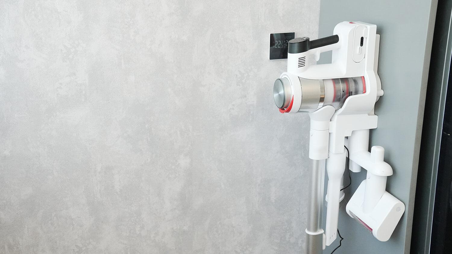 - Práctico soporte de pared para la carga inalámbrica de la aspiradora y el almacenamiento de los accesorios incluidos.