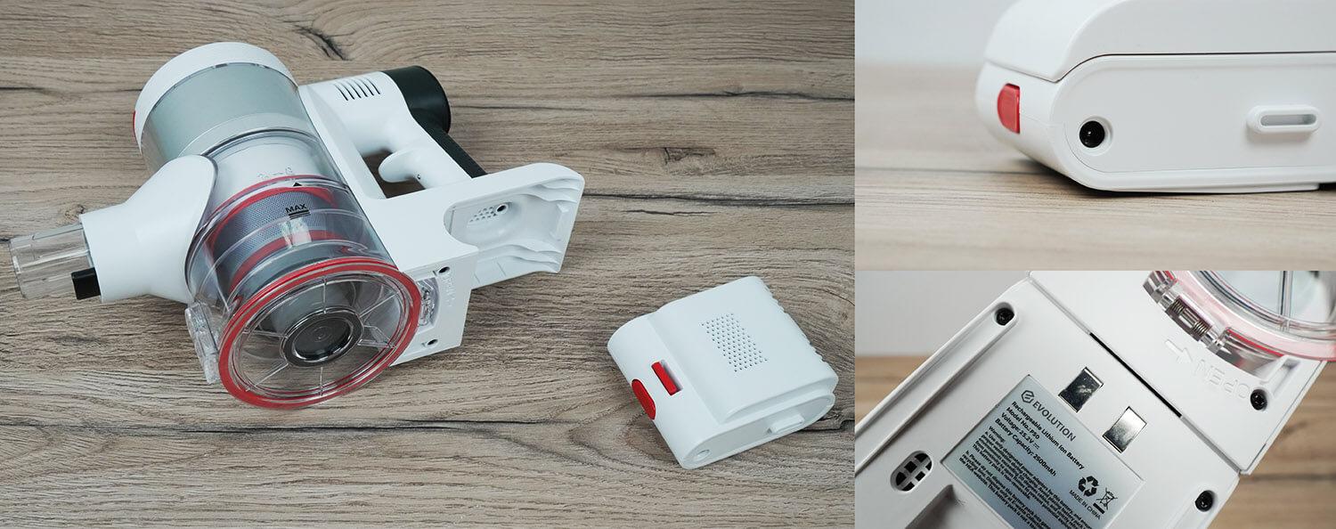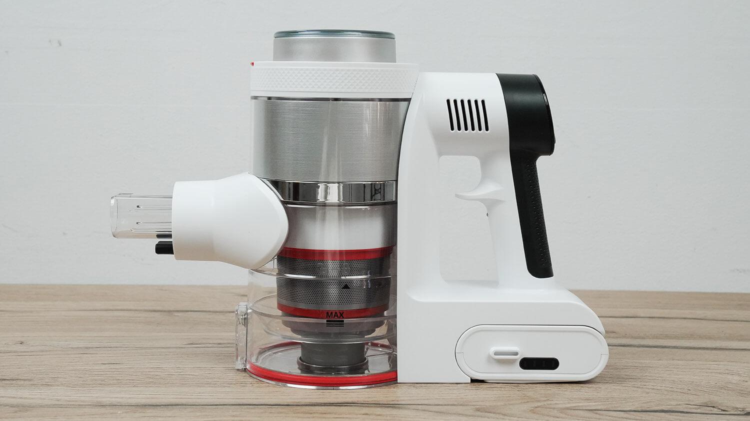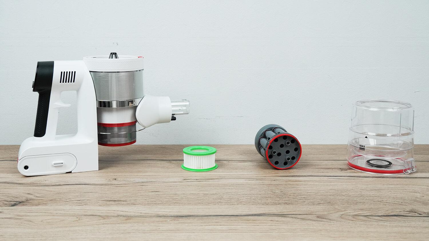 El depósito de polvo se vacía presionando un botón de liberación en la parte inferior, que lo abre. Una característica interesante es la limpieza manual de la malla metálica del depósito. Para ello, tire de la manija roja en la parte superior y la malla se elevará, eliminando los residuos acumulados, el pelo de las mascotas y el pelaje. El depósito de polvo se puede extraer completamente de la unidad principal, lo cual resulta muy práctico. Además de la malla metálica, un sistema multiciclónico proporciona filtración. Un filtro HEPA también está instalado debajo de la cubierta superior, con una malla delante. En general, el sistema de filtración es bueno para este rango de precio.