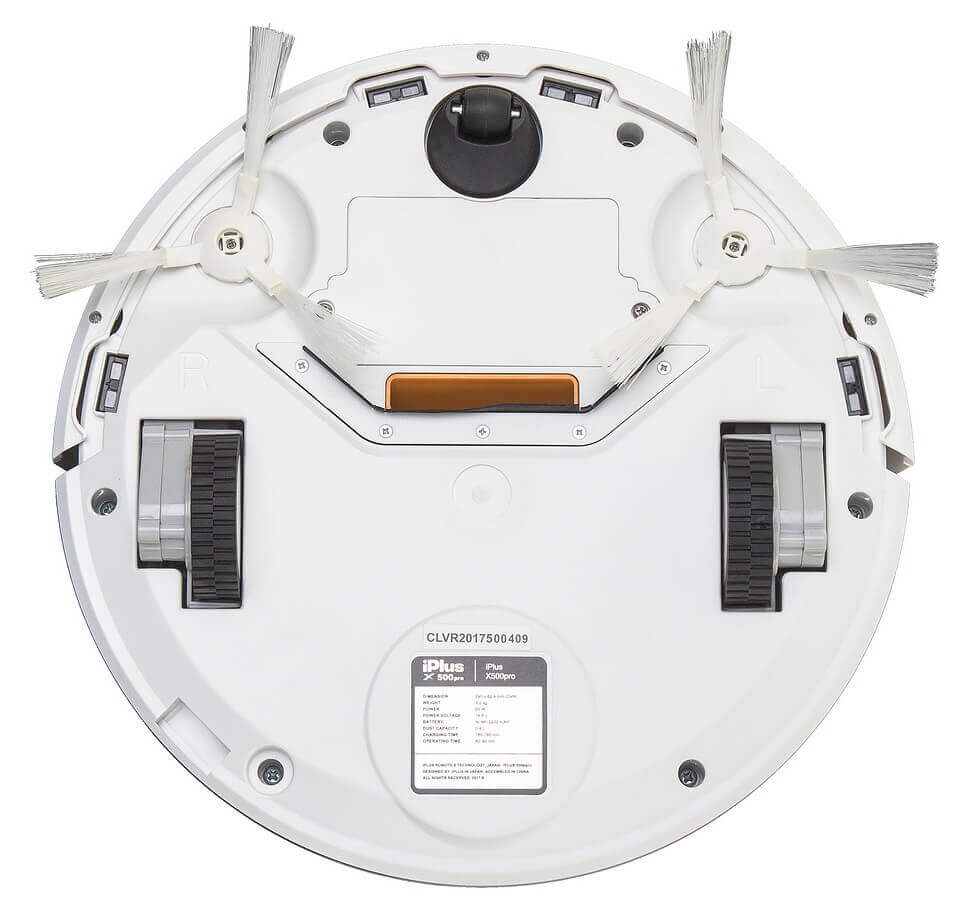 La parte trasera del iPlus X500 pro se ve así: dos cepillos laterales con tres cepillos cada uno, dos ruedas motrices, una pequeña rueda delantera para girar, una tapa del compartimento de la batería, un orificio de succión y una pegatina que contiene una descripción de las principales características del dispositivo.