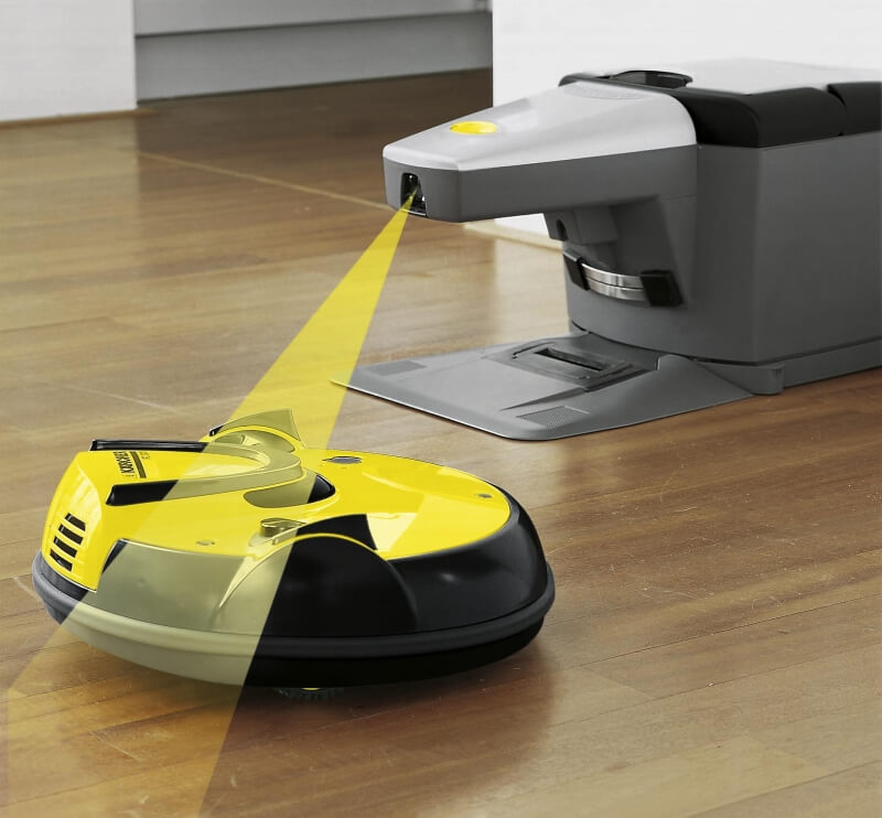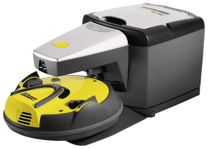 El diseño de la empresa alemana Kärcher es bastante inusual. Esto se logra mediante la inclusión de una estación de carga única que también funciona como contenedor de basura.