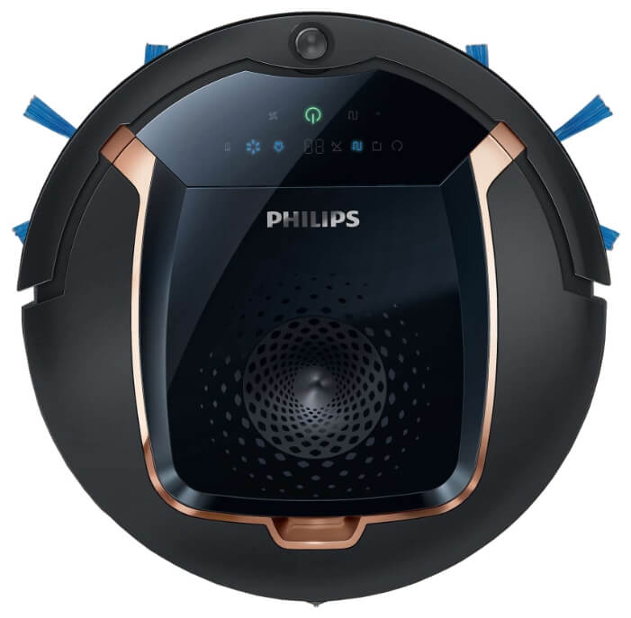 El diseño del robot Philips se muestra en la foto de abajo. Como puede ver, tiene un elegante acabado en negro intenso. En general, tiene una apariencia muy moderna y atractiva. La tapa es brillante. Los modelos de titanio también son comunes. La aspiradora tiene pantalla y reloj integrados.