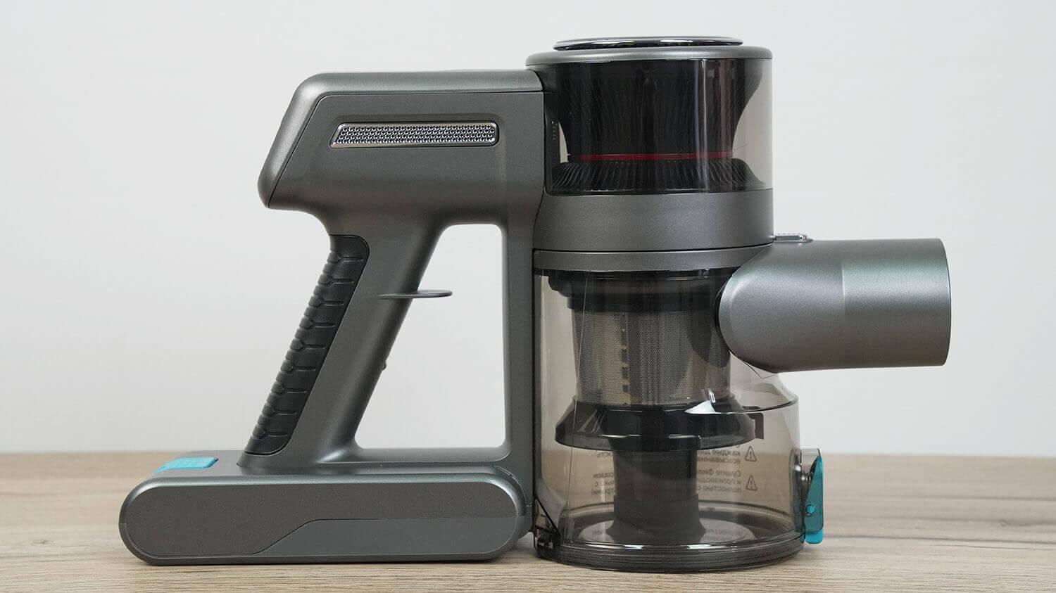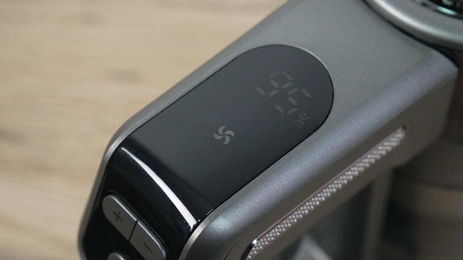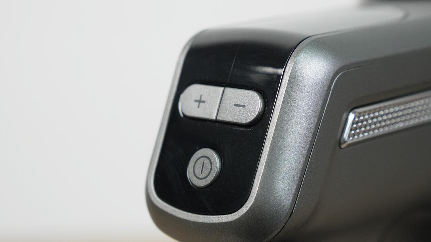Como habrás notado, la aspiradora no tiene un gatillo tradicional. Se enciende y se apaga con un botón en el extremo. Dos botones mecánicos más para ajustar la potencia de succión se encuentran convenientemente ubicados cerca. Los controles son prácticos, con un panel de control fácil de usar con una sola mano.