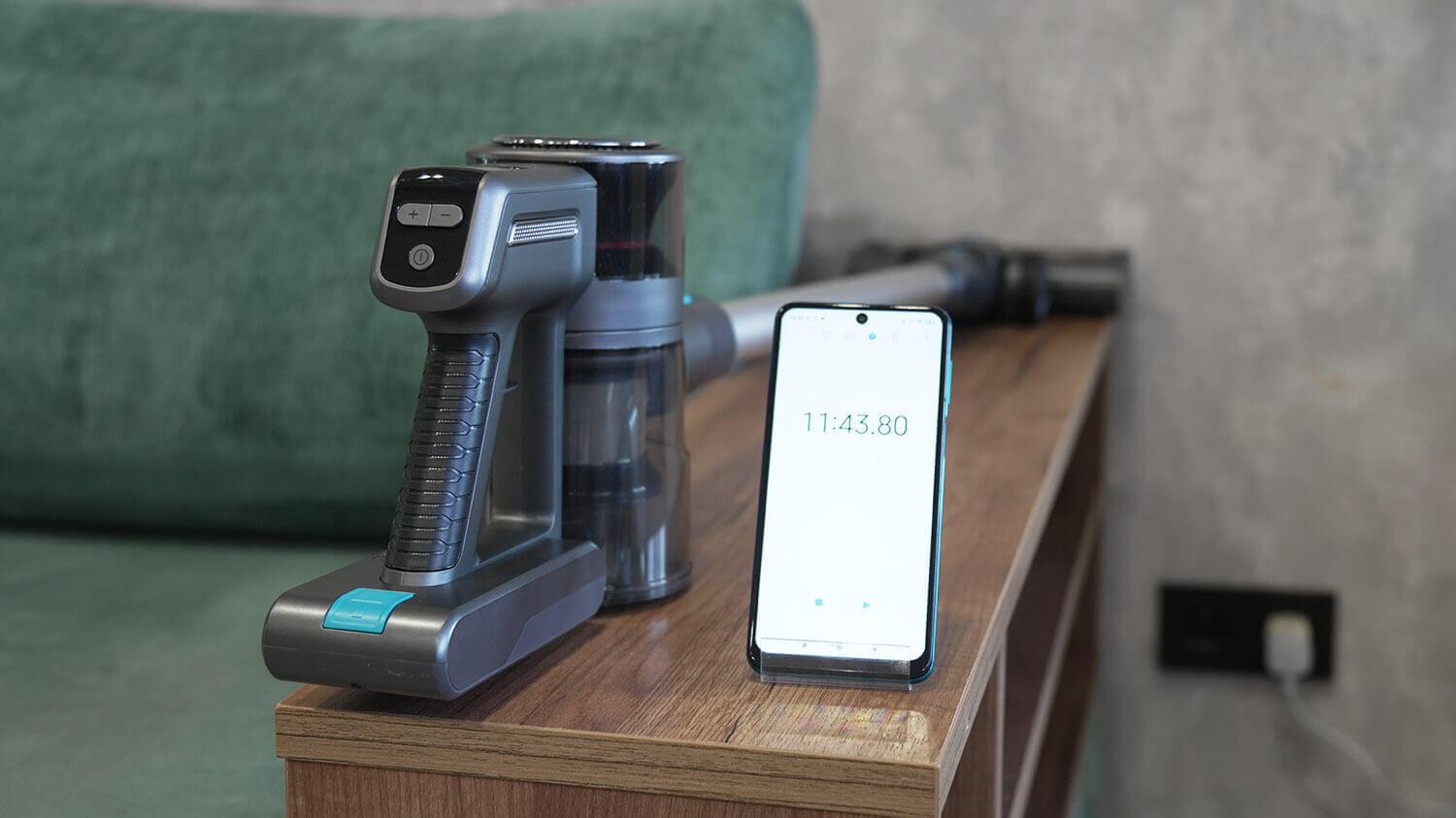 Y finalmente, pasemos a las pruebas. Primero, comprobemos la duración de la batería del Teqqo Powerstick BASIC en modo Turbo con la boquilla principal para suelos conectada. Logró 11 minutos y 43 segundos de autonomía, lo cual es bastante normal.