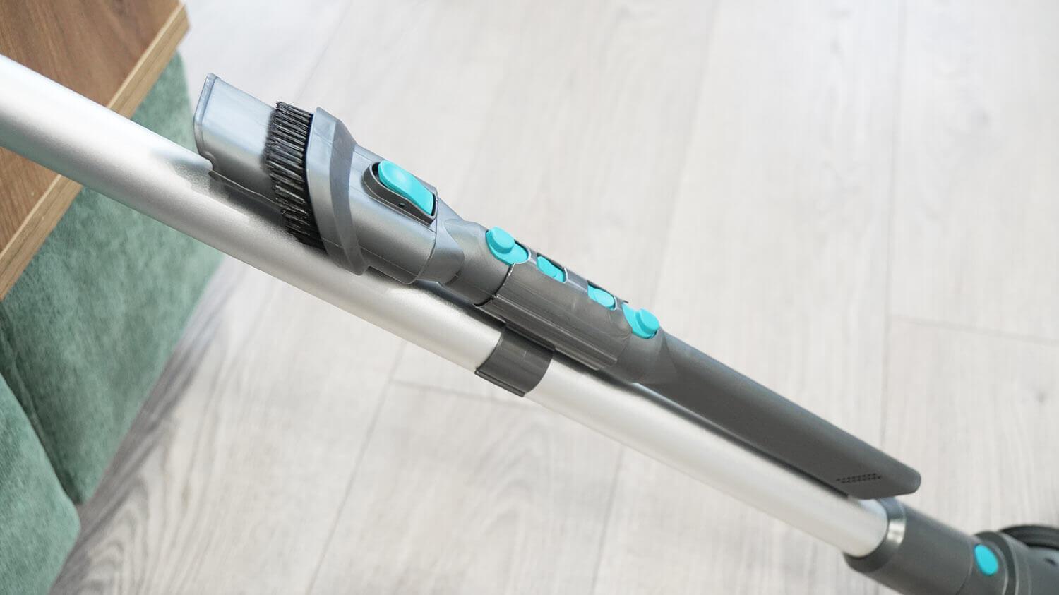 Cabe destacar que la Teqqo Powerstick BASIC se puede guardar verticalmente fuera del soporte de pared. Esto resulta muy práctico. Y como puede ver, es muy práctico guardar los accesorios incluidos en la propia aspiradora.