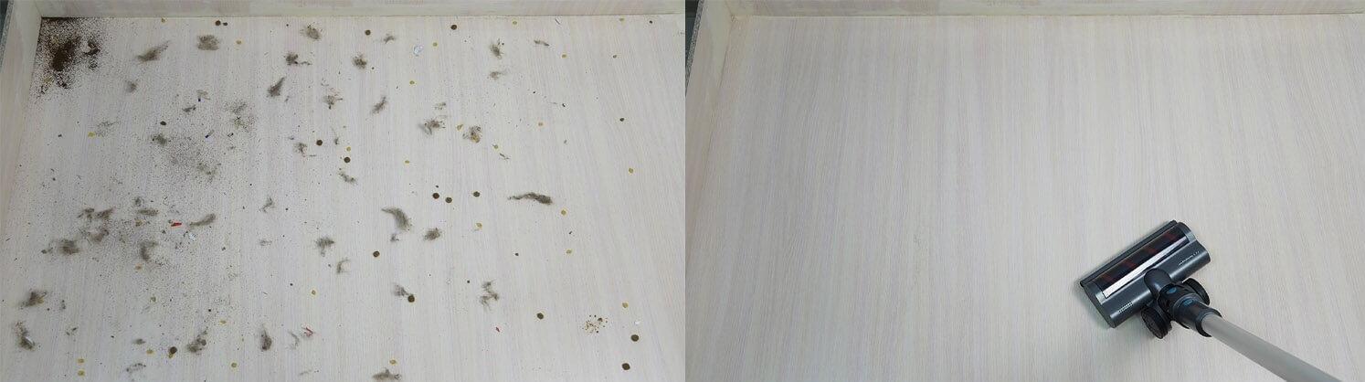 Ahora, probemos qué tan bien recoge la suciedad del suelo el Teqqo Powerstick BASIC. Esparcí varios tipos de suciedad sobre el suelo laminado: pelo, piel, granos y otros pequeños residuos domésticos. Este dispositivo funcionó bien. Cabe destacar que recoge sin problemas la suciedad de los zócalos y las esquinas. Recoge todo a fondo. No queda pelo ni pelusa en el rodillo. Toda la suciedad se recoge en el depósito de polvo. ¡Prueba superada!