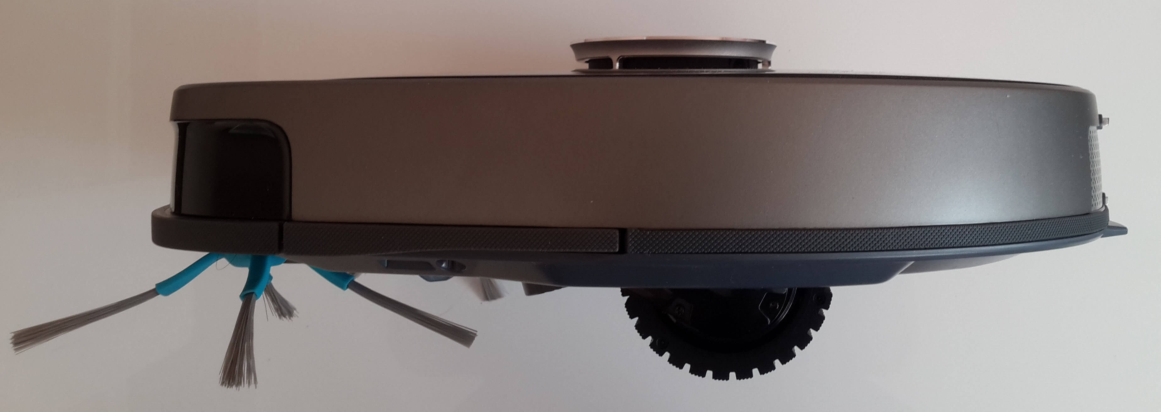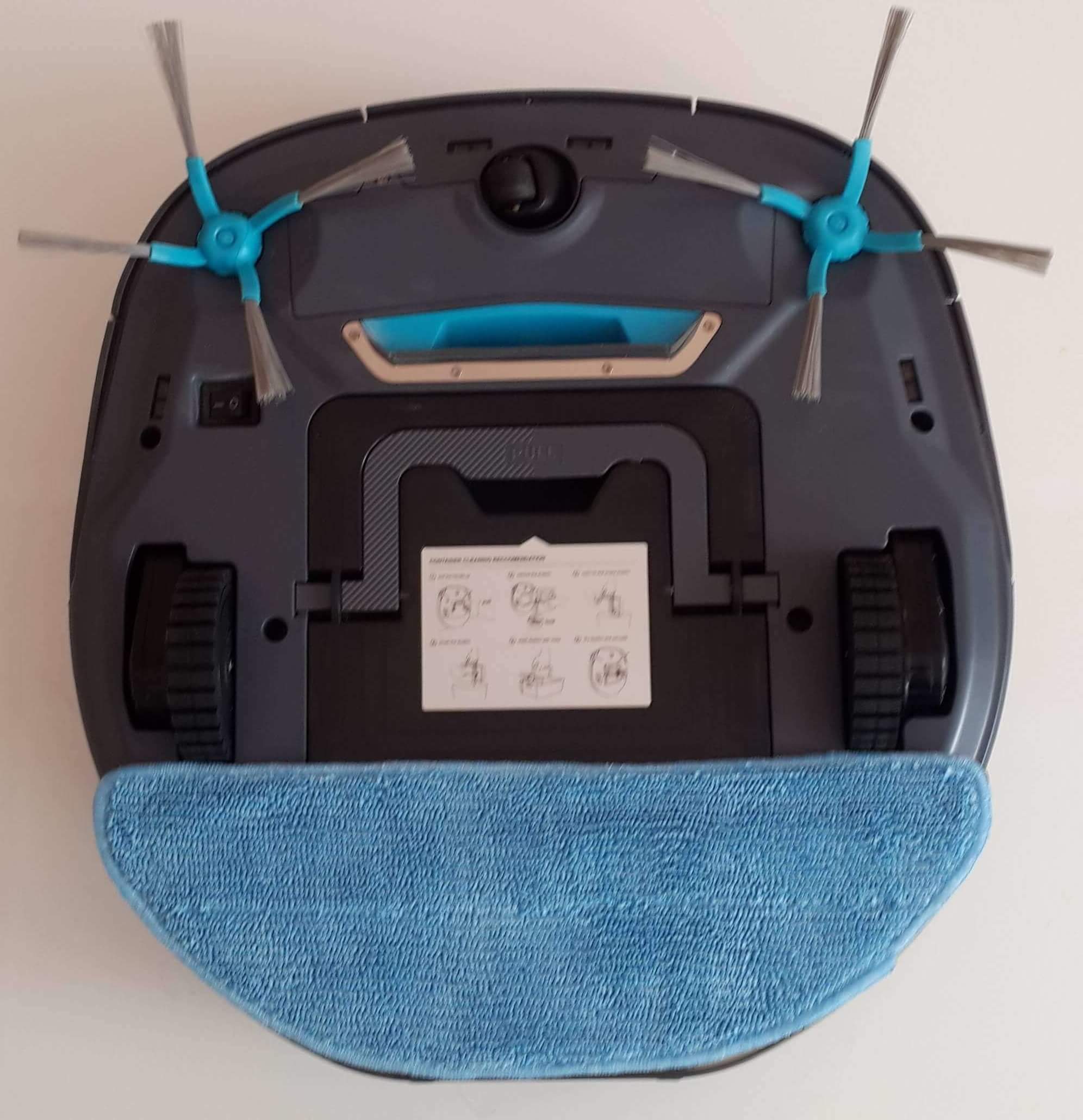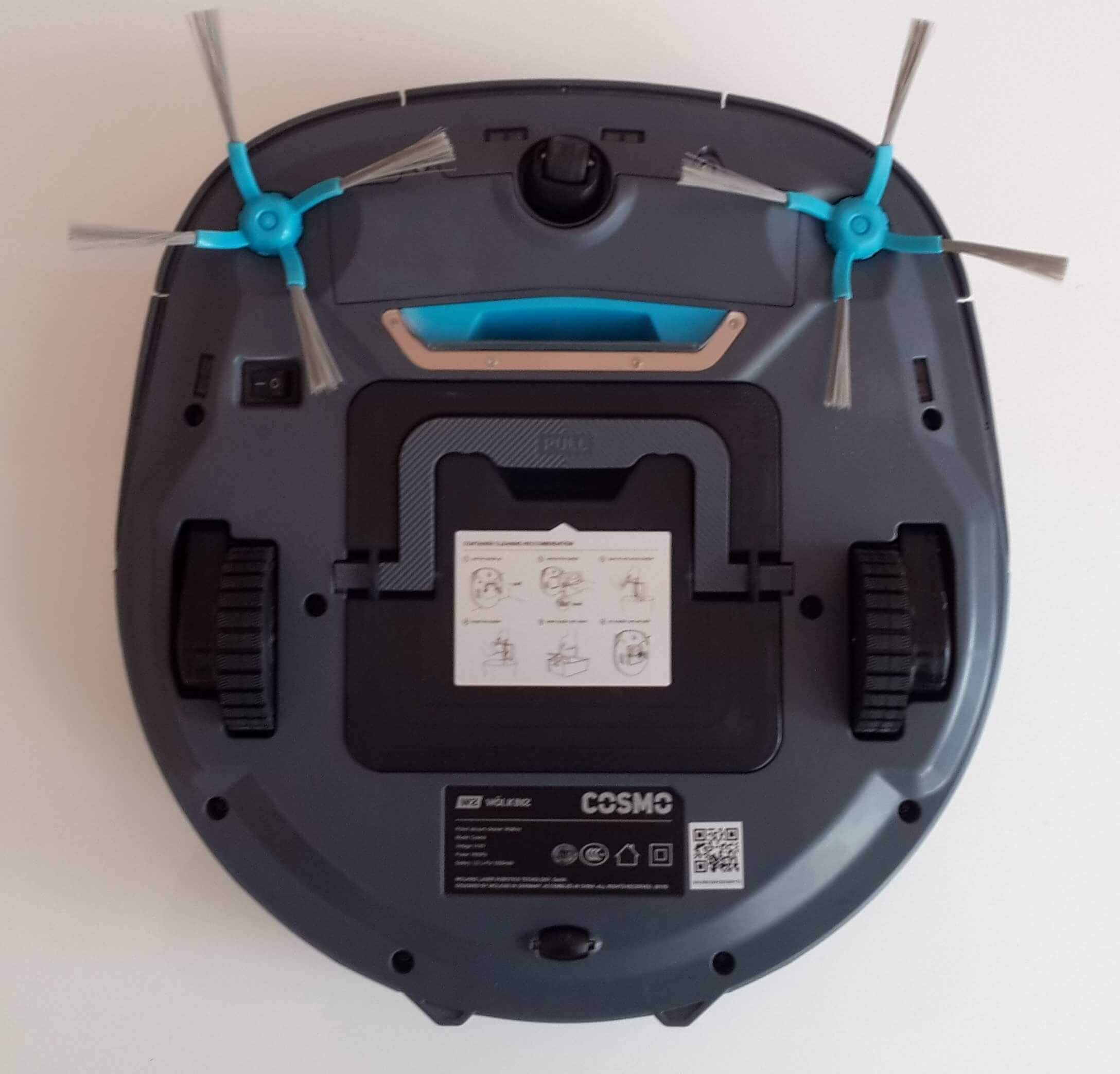Si colocas el robot aspirador boca abajo, verás dos cepillos laterales, un botón de encendido/apagado, ruedas motrices, una rueda auxiliar, una rueda giratoria y sensores de altura. El puerto de succión, que permite la limpieza en seco, también se encuentra ahí. Ten en cuenta que el depósito de polvo del Wolkinz Cosmo se encuentra en la parte inferior, a diferencia de la mayoría de los robots (la tapa suele abrirse desde arriba). Esta ubicación es más cómoda, ya que al retirarlo para vaciarlo se evita que los residuos se derramen al suelo.