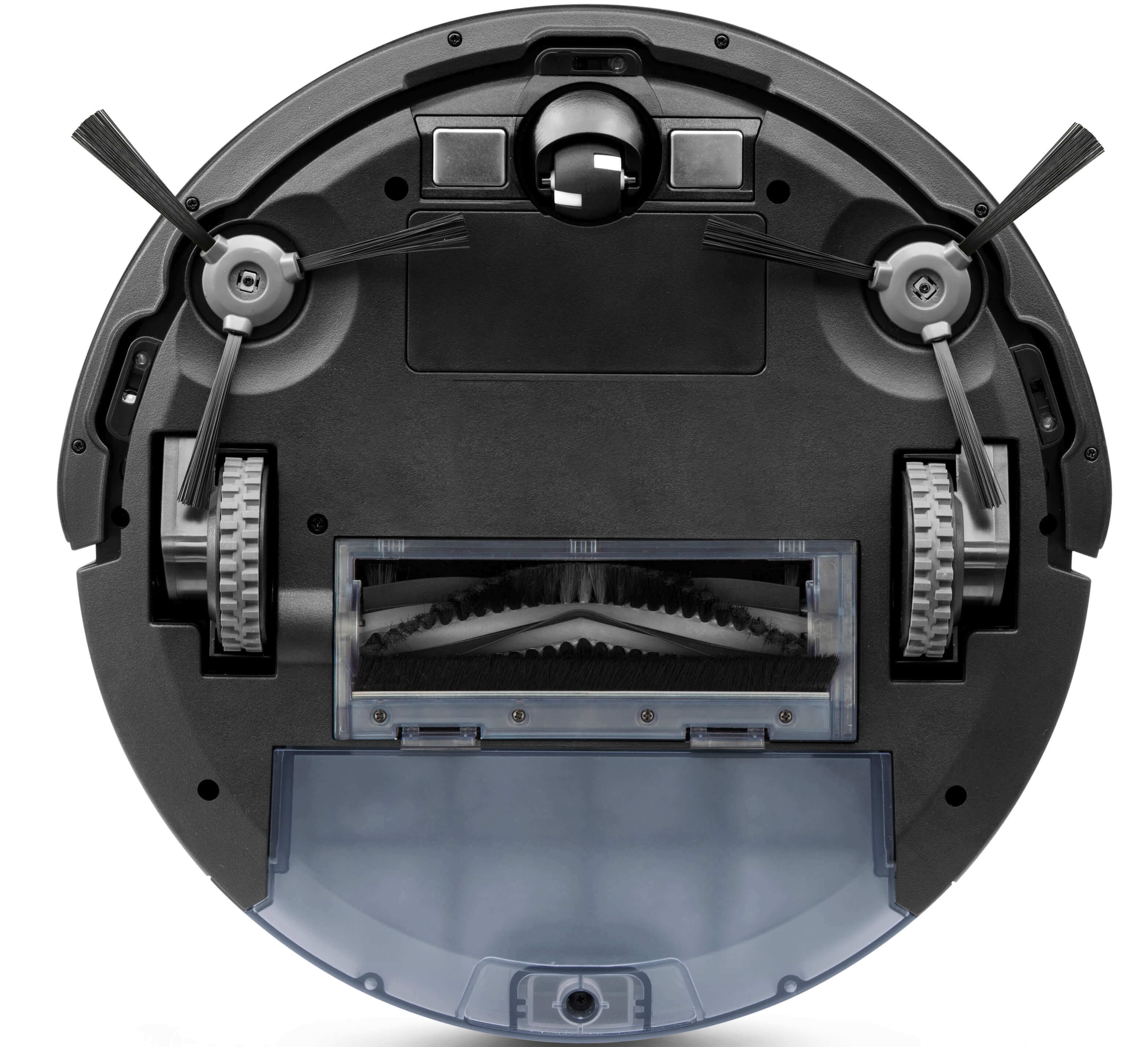 Al observar la aspiradora robot desde atrás, se observan un par de ruedas motrices, una rueda giratoria delantera, terminales de carga, sensores anticaída, un compartimento para la batería bajo la tapa, dos cepillos laterales y un cepillo principal cerca del centro. Un paño de microfibra está fijado al fondo del depósito de agua.