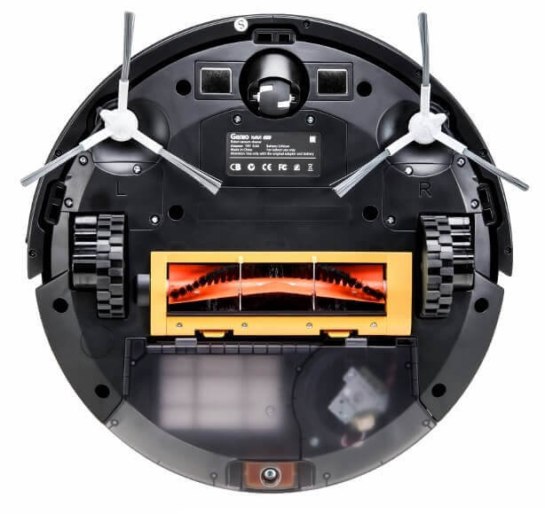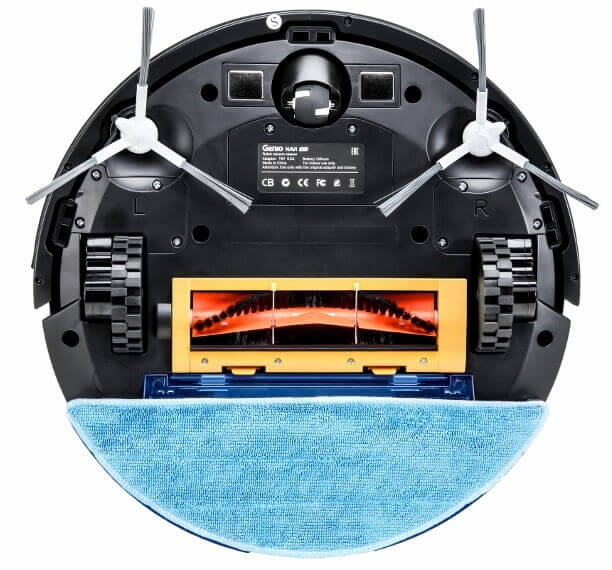 Al girar la aspiradora robot, se descubren dos cepillos laterales, un cepillo central de cerdas y pétalos, ruedas y un rodillo giratorio. El cepillo central se desmonta fácilmente para limpiar pelos y pelos de mascotas. También se puede colocar un paño de microfibra en la parte inferior para una limpieza en húmedo.