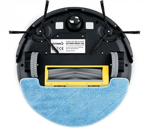 Al dar la vuelta al robot aspirador, vemos dos grandes ruedas móviles recubiertas de goma que permiten al dispositivo superar obstáculos de hasta 1,5 cm de altura, una rueda frontal para maniobrar, terminales para recarga automática en la estación de acoplamiento, un par de cepillos laterales que giran uno hacia el otro, sensores de detección de altura, una tapa del compartimento de la batería, un orificio de succión y un cepillo rascador central de goma.