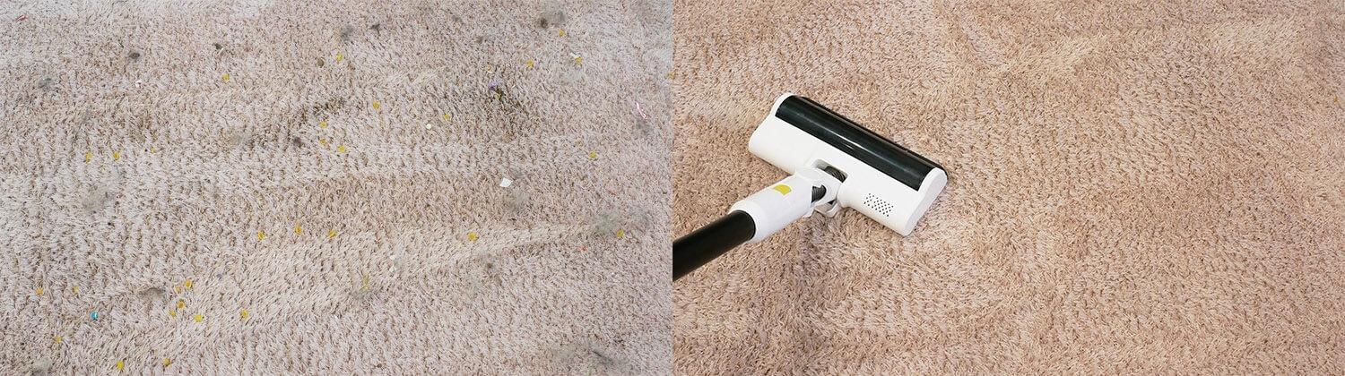 Los mismos residuos se esparcieron sobre la alfombra, y el Lydsto H4 hizo un trabajo igualmente bueno al limpiarla. El rodillo esponjoso para pisos duros, aunque no es tan efectivo en alfombras, aún es capaz de recoger los residuos superficiales.