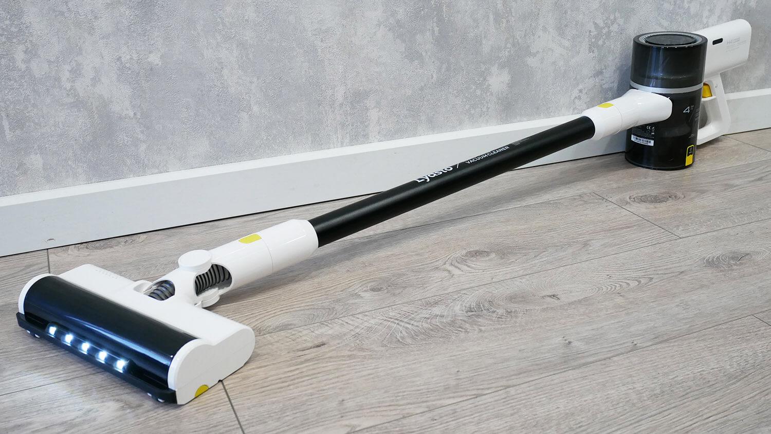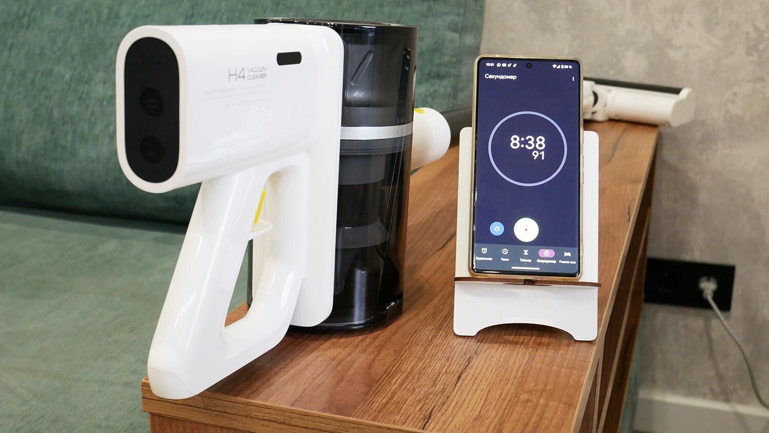 Y finalmente, pasemos a las pruebas. Primero, comprobemos la duración de la batería de la Lydsto H4 en modo Turbo con la boquilla principal para suelos conectada. Logró funcionar durante 8 minutos y 38 segundos, un tiempo ligeramente superior al que afirma el fabricante, pero entre 3 y 4 minutos menos que la mayoría de modelos similares. Cabe destacar que la aspiradora puede funcionar hasta 20 minutos a potencia media y hasta 60 minutos a potencia baja.