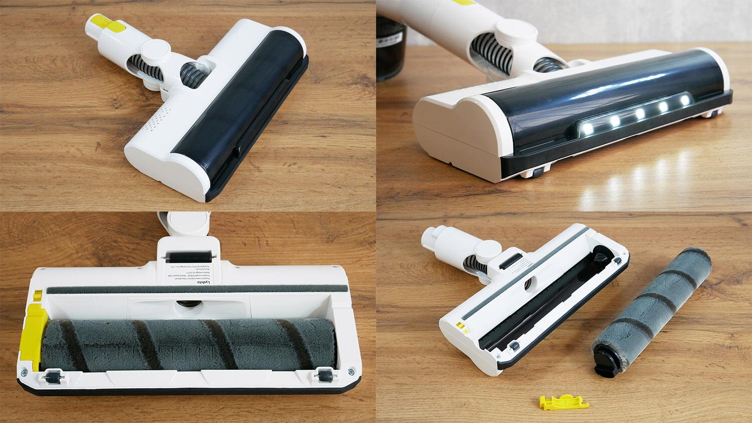 La boquilla principal para suelos cuenta con una articulación giratoria y un rodillo suave para suelos duros. Detrás del rodillo hay un puerto de succión. El bloqueo del rodillo se puede quitar manualmente, lo que elimina la necesidad de herramientas. También está equipada con una luz LED que permite una limpieza mejorada en zonas con poca luz.