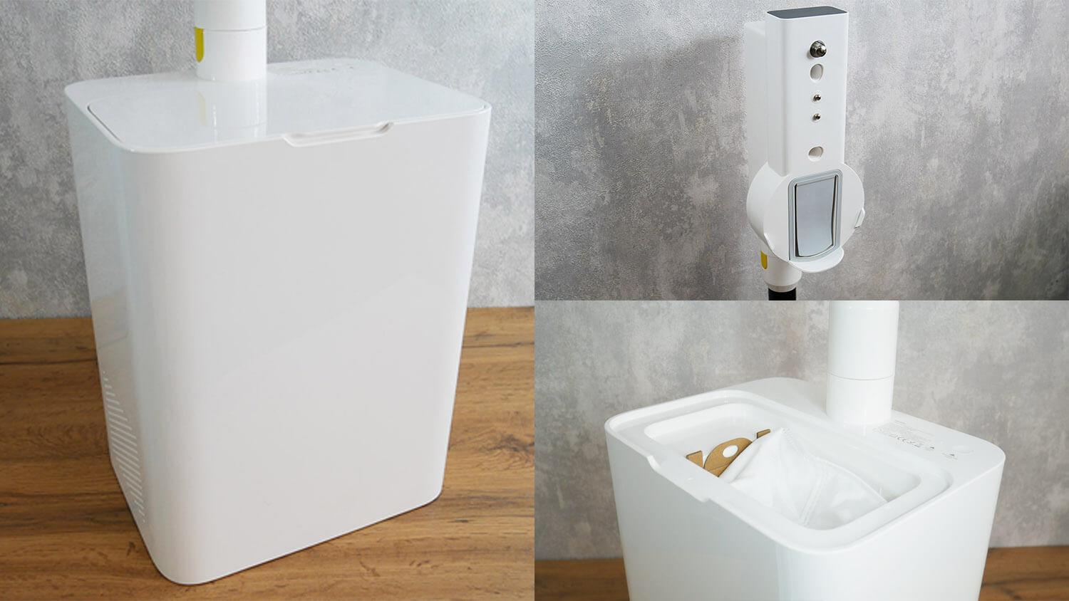 La característica principal de la aspiradora es su base de carga. La sección superior alberga la unidad principal. Esta base cuenta con terminales de carga inalámbrica y un canal de succión para la autolimpieza del depósito de polvo.
