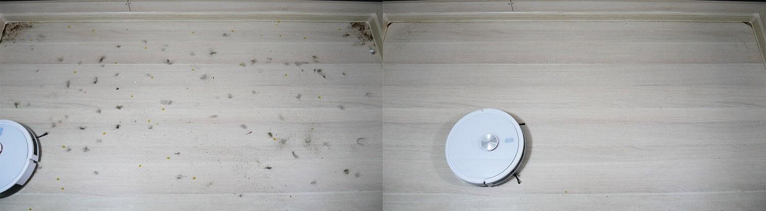 El rendimiento de la limpieza en seco en suelos laminados es bueno. El robot aspirador recogió la mayor parte de la suciedad del suelo, incluyendo no solo pequeños residuos domésticos, sino también pelos de mascotas. Solo una pequeña cantidad de suciedad quedó en las esquinas, donde casi todos los robots circulares del mercado no limpian eficazmente. Los cepillos central y lateral atraparon algo de pelo de mascotas. La mayor parte de la suciedad se recogió en el depósito de polvo. ¡Prueba exitosa!