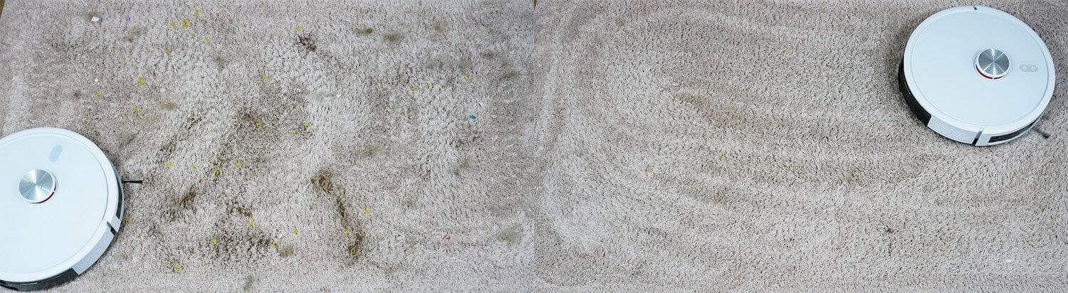 Los mismos residuos se esparcieron sobre una alfombra de pelo medio. El Lydsto R5D también tuvo un rendimiento ligeramente inferior. Recogió la mayor parte de los residuos, pero quedó algo de pelo y piel en la alfombra. Esto se debe a que el cepillo central no es flotante y a que su potencia no es muy alta. Sin embargo, ¡el robot es capaz de limpiar alfombras superficialmente!