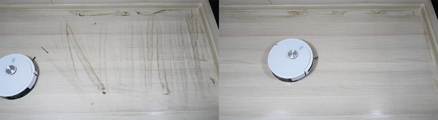 Tampoco hay quejas sobre la limpieza en húmedo. La calidad de la limpieza de la suciedad en suelos laminados es comparable a la de productos similares. Solo queda una franja estrecha a lo largo del zócalo, pero este es un punto débil de la mayoría de las aspiradoras robóticas analizadas.