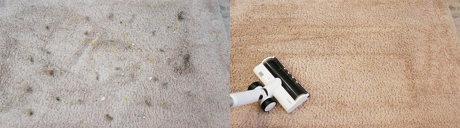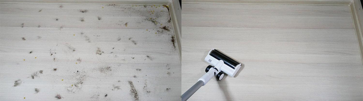 Los mismos residuos se esparcieron sobre la alfombra, y la Lydsto V11H también limpió bien la alfombra. Esto se debe a la estructura del rodillo, especialmente diseñada para la limpieza de alfombras.