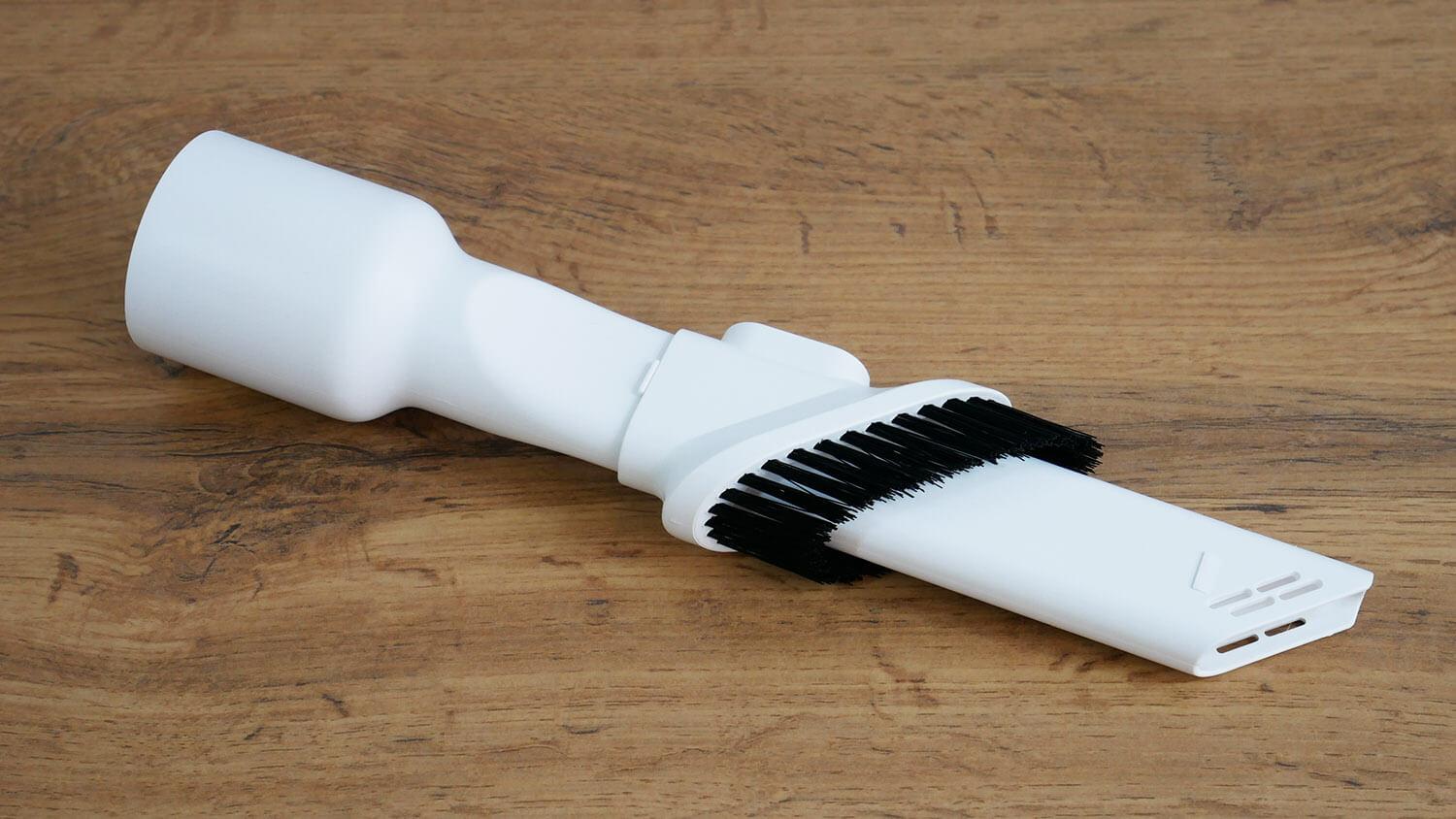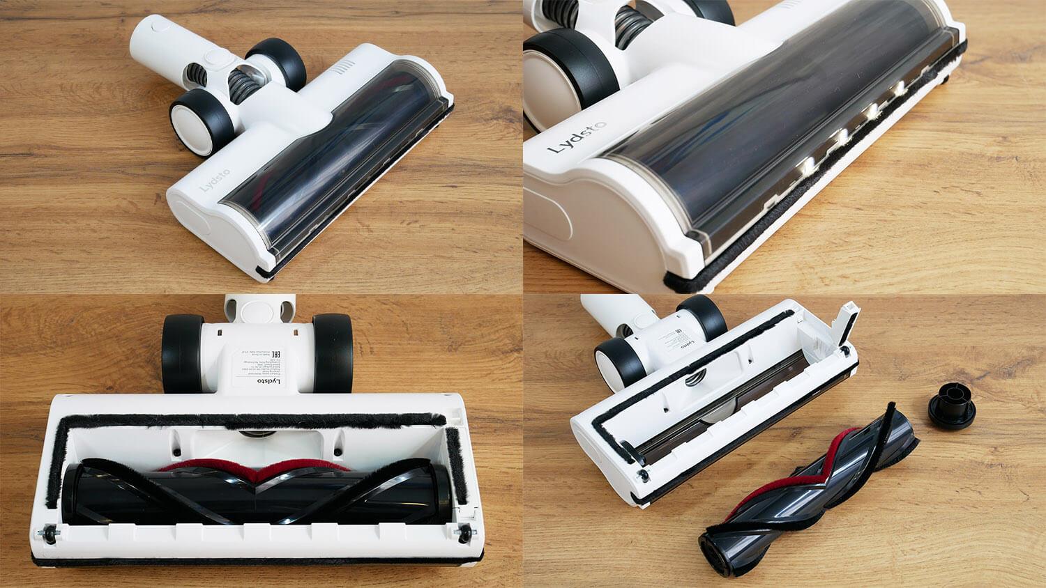 Echemos un vistazo a los accesorios incluidos. La boquilla principal para suelos cuenta con ruedas bastante grandes y una articulación giratoria. El rodillo tiene cerdas cortas y flexibles. Este tipo de rodillo es eficaz en alfombras y también ha demostrado su eficacia en superficies duras. La parte frontal cuenta con iluminación LED para iluminar el área de limpieza, otra ventaja del Lydsto V11H.