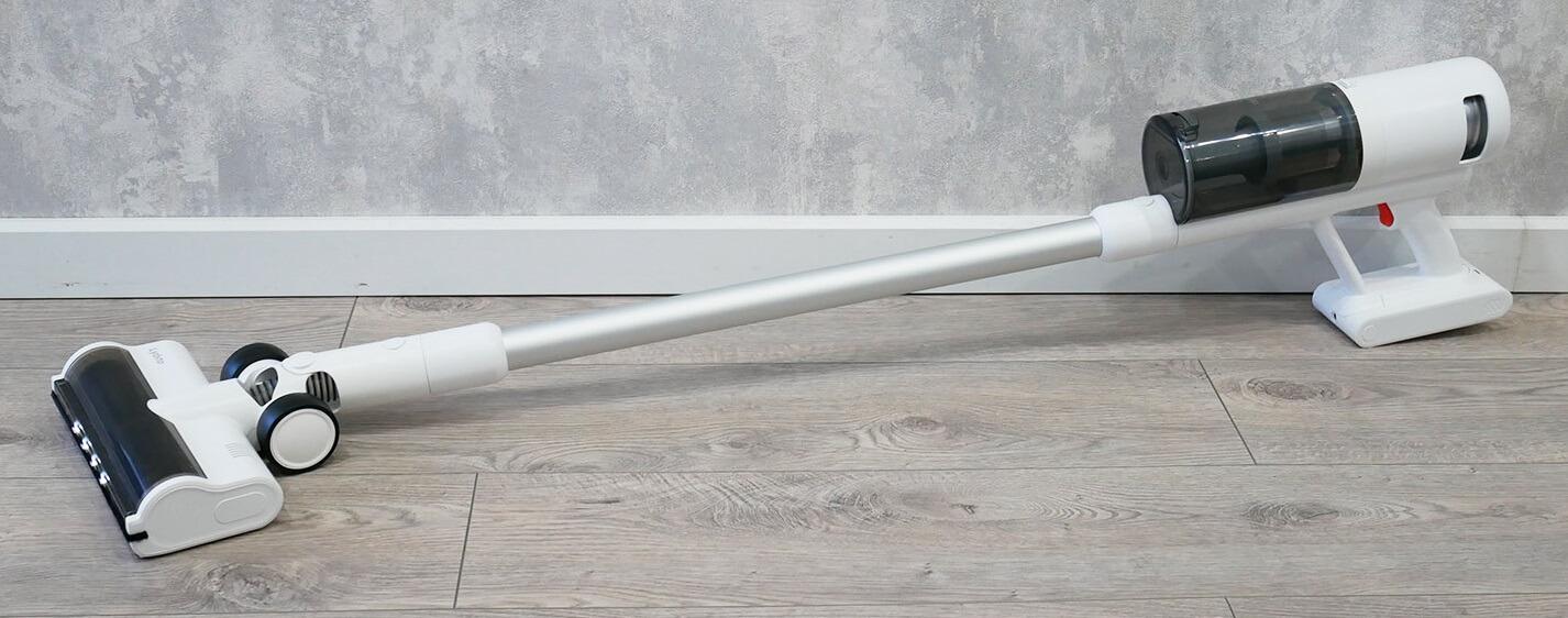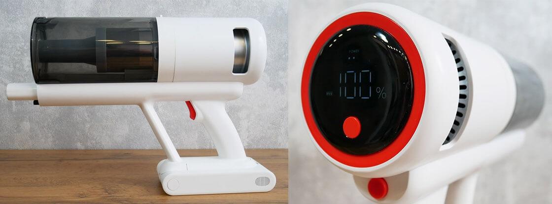 Echemos un vistazo al diseño del Lydsto V11H. Empecemos por la unidad principal. Es blanca. Los botones están resaltados en rojo, lo que facilita su uso. Una pantalla informativa se encuentra en el extremo. Muestra el nivel de energía, la carga de la batería y los mensajes de servicio.