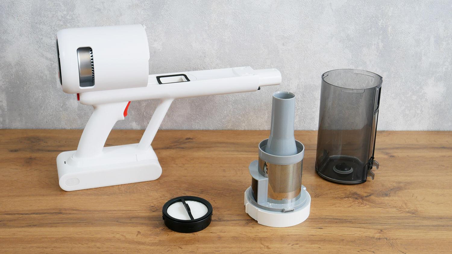 La batería es extraíble, lo cual es una ventaja. También cuenta con un puerto de carga. El depósito de polvo también es extraíble, ¡lo cual es genial! Contiene un filtro HEPA, un ciclón y una malla. En total, hay tres etapas de filtración visibles.