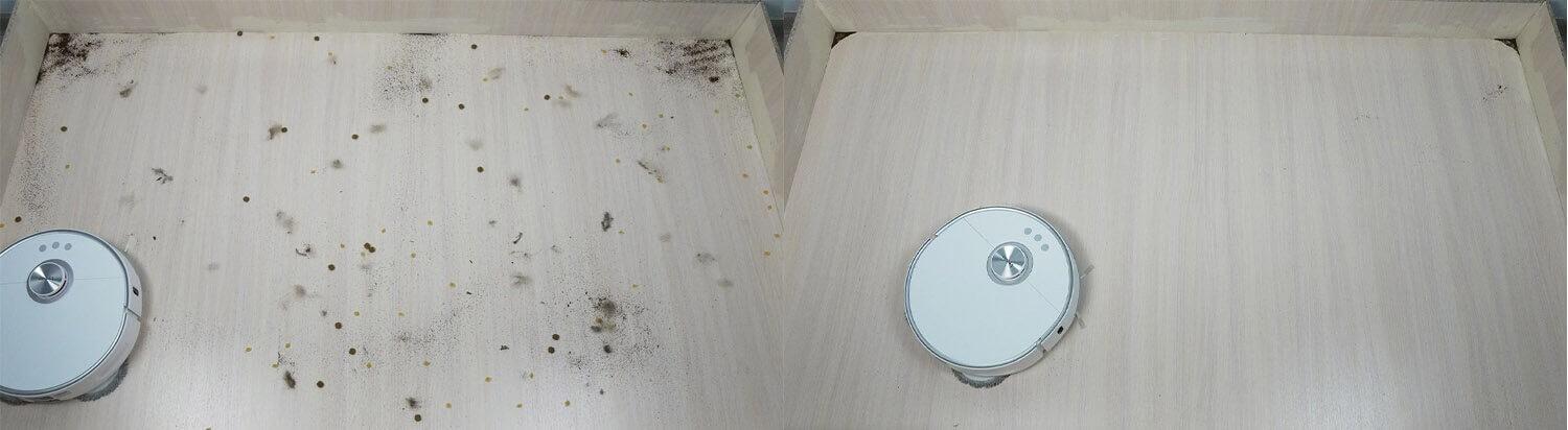 El rendimiento de la limpieza en seco en suelos duros es excelente. El robot aspirador recogió completamente la suciedad del suelo. Dejó algo de suciedad en las esquinas, como la mayoría de los robots redondos. Algunos pelos se engancharon en el cepillo central. Sin embargo, la mayor parte de la suciedad se recogió en el depósito de polvo. ¡Prueba superada!