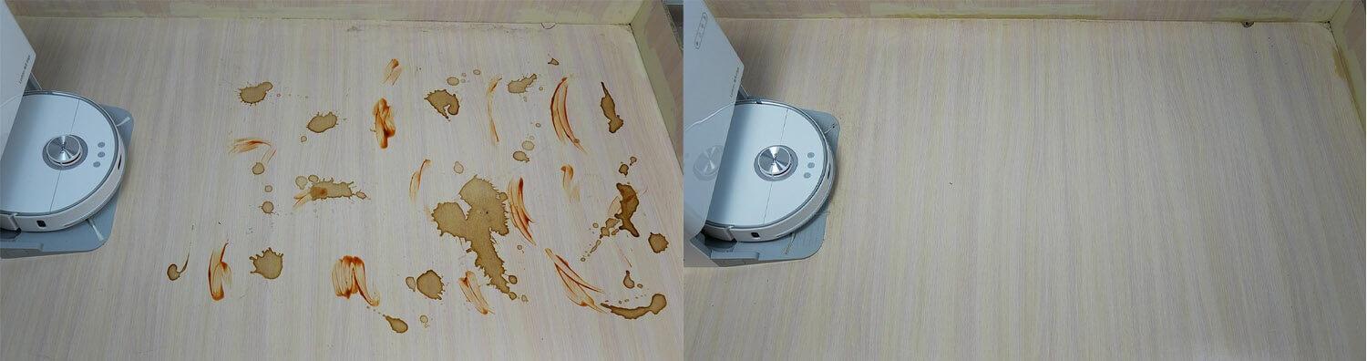 El Lydsto W2 Edge tuvo dificultades para eliminar manchas secas de café y salsa. Logró eliminar las manchas de café, pero solo parcialmente la salsa. En su defensa, cabe mencionar que no está diseñado para este tipo de uso. La prueba solo muestra que la presión de los paños sobre el suelo no es tan fuerte como la de los robots limpiadores de suelos especializados.