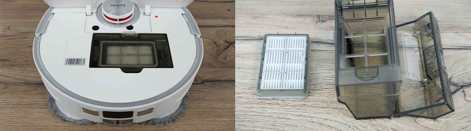 El contenedor de polvo tiene una capacidad de 350 ml de residuos secos. En su interior, hay una cortina que aspira los residuos hacia una bolsa en la estación. El sistema de filtración es exclusivamente HEPA.