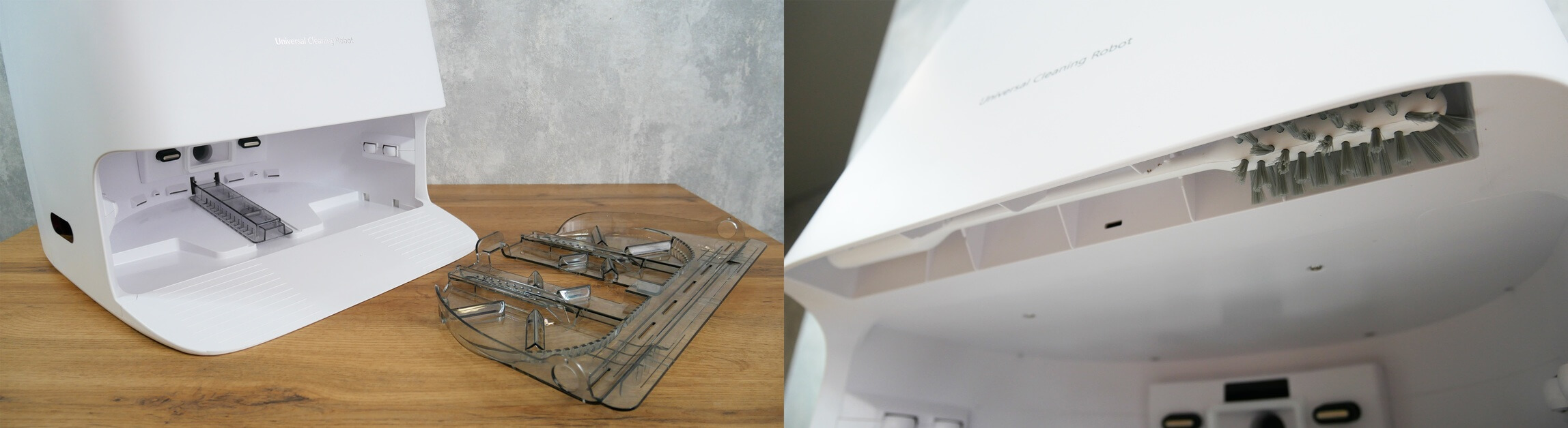 La plataforma donde se colocan las toallitas autolimpiables cuenta con un módulo extraíble. Es una pena que la bandeja no sea completamente extraíble ni plana, pero facilita la limpieza. Otra característica interesante es el compartimento para el cepillo de limpieza de la estación. Está cómodamente montado sobre la plataforma de acceso del robot.