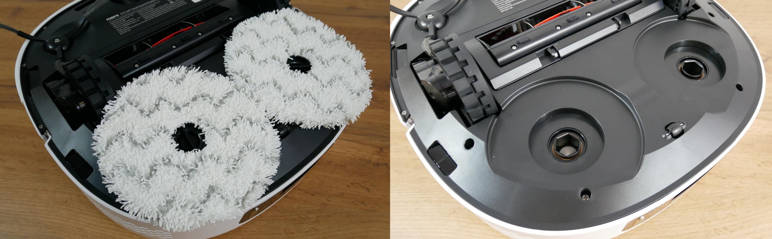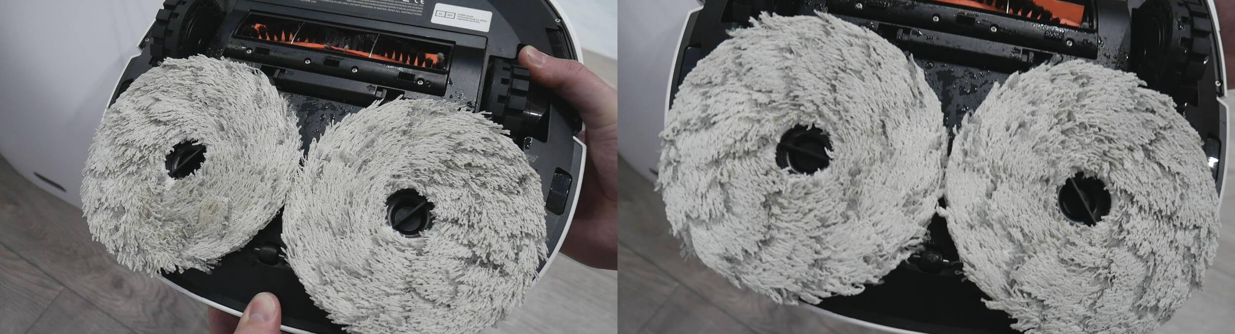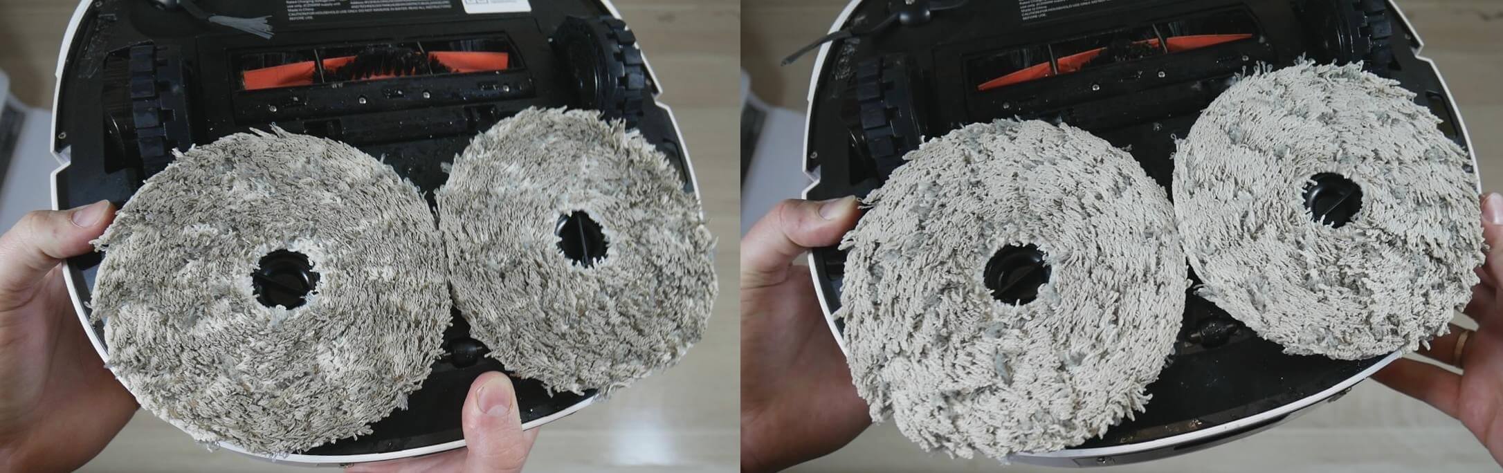 Las almohadillas de limpieza se sujetan al robot mediante imanes. Son bastante gruesas, más que las de otros robots que he analizado. No se levantan en las alfombras, algo importante a tener en cuenta. También cabe destacar que las almohadillas se extienden más cerca de los bordes del cuerpo del robot, por lo que preveo que limpiarán mejor la suciedad de los zócalos que otros robots similares. Sin duda, lo probaré en mis pruebas.
