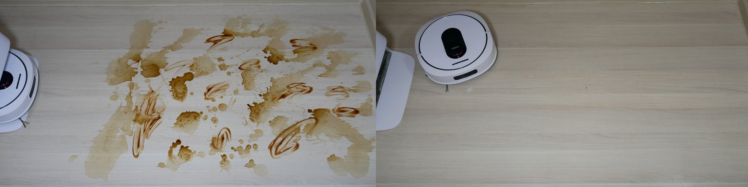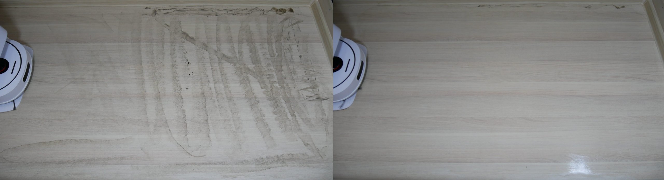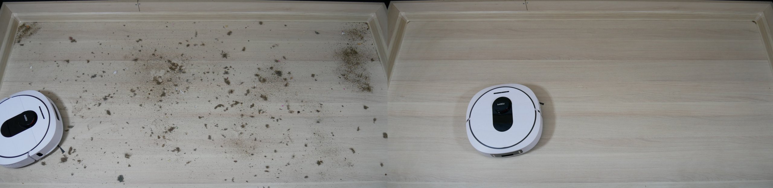 El robot aspirador elimina bien la suciedad seca. Recogió toda la suciedad del suelo en la primera pasada, prácticamente sin dejar marcas. Luego, enjuagó las toallitas y limpió a fondo el soporte una segunda vez. Las toallitas eliminan la suciedad más cerca del zócalo, pero no a la perfección. Quedan unos 3 cm sin limpiar, pero la franja sin lavar de productos similares es más ancha (de 4 a 5 cm). Por lo tanto, el robot tiene una ligera ventaja.
